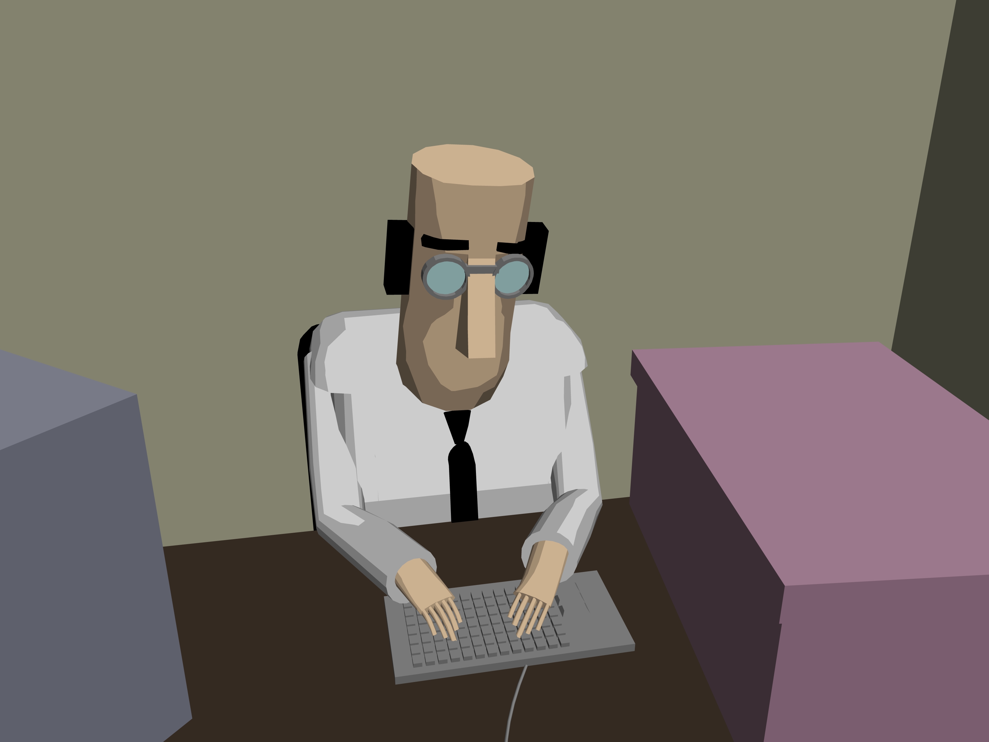 Langweilig und gelangweilt sitzt ein Schreibtischmensch (mit röhrenförmigem Kopf) an seinem Schreibtisch und schreibt, links vor sich einen Computer. Man hört das Klack-klack der Tasten, Bürogeräusche dringen aus den Nebenräumen. Rechts steht eine große Schachtel, in die er immer wieder einen Blick wirft.