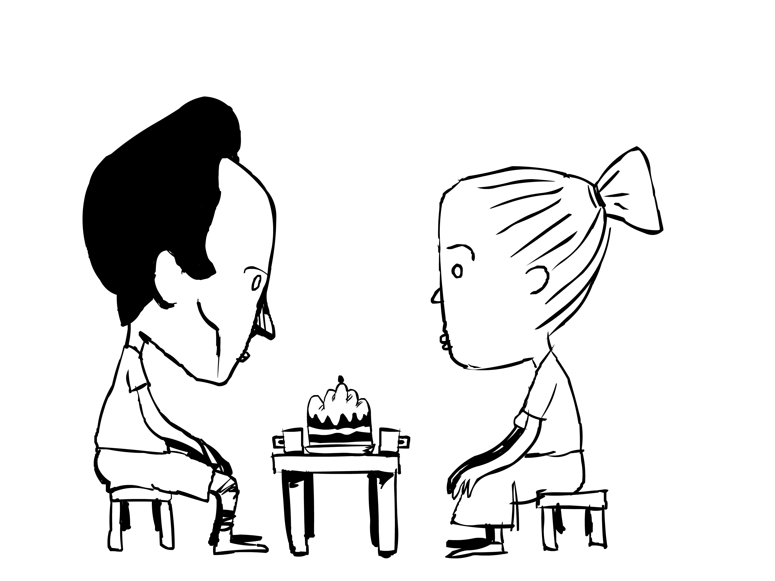 Flach gezeichnete Figuren mit voluminösen Schädeln: Mann und Frau sitzen konsequent einander gegenüber, bei Kaffee und Kuchen. Eine Rendezvous-Situation? Entpuppt sich Boring unerwarteterweise als Liebesgeschichte, wird Loving zum Kampf ums Buffet, zum Duell.