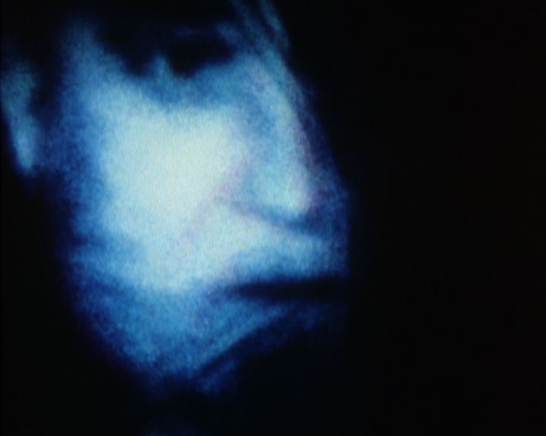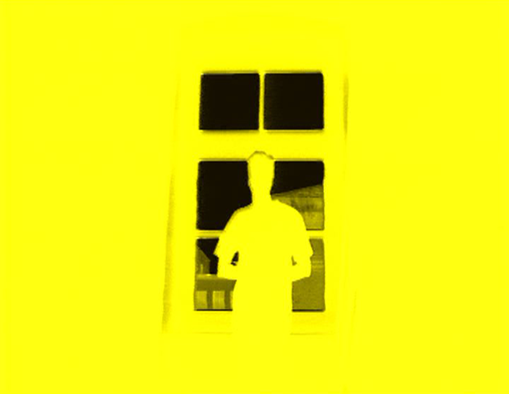 Gelbgefärbtes und flach gefilmtes Hi8-Negativbild eines Fensters, vor dem ich posiere. Das flache Filmbild wird durch eine Geräuschtonkonstruktion immer tiefer...