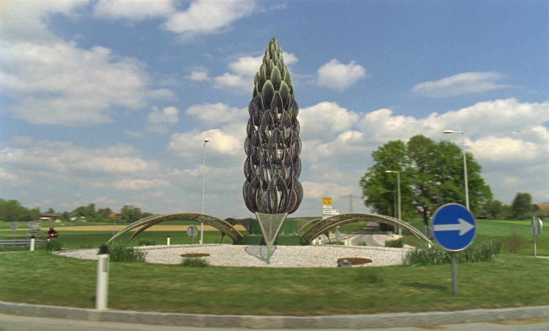 Um eine sehr spezielle Form des Straßenbaus dreht sich dieser Film, ganz buchstäblich. Eine Art Raumschiff aus Beton, eine zum Kreisverkehr ausgebaute Unterführung, stellt das noch tonlose nächtliche Einstiegsbild des Films. 22 Sekunden lang wird die futuristische Anlage umrundet, ehe der Titel der Arbeit – Kreis Wr.Neustadt – auftaucht und mit ihm das Knattern des Motors, das den Rest des Films begleiten wird: Von einer Vespa aus lässt Johann Lurf knapp 100 niederösterreichische Kreisverkehrsinseln in immer groteskeren Ausführungen dokumentieren, jeweils nur wenige Sekunden lang – und erstellt dabei so etwas wie einen Katalog lokaler Bausünden. Die Mittelinseln, die er zeigt, sind mit Kies, Zierhecken oder Steinskulpturen, mit Weinstöcken, Springbrunnen oder Deko-Blumenbeeten besetzt, mit Hinweisschildern, Verkehrszeichen oder Werbeobjekten versehen.