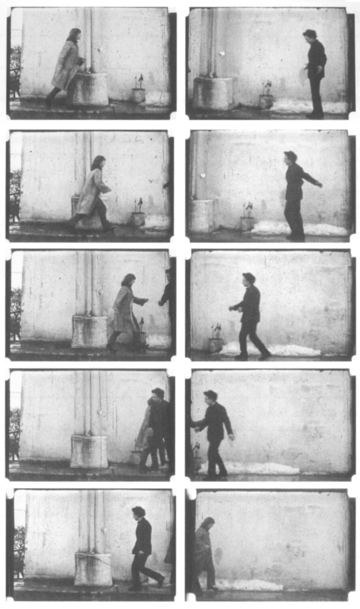 Ein struktureller Film über das Zeitproblem: dieselbe Szene wurde gleichzeitig mit zwei Kameras, die von verschiedenen Seiten auf den Mittelpunkt der Szene geschwenkt wurden, aufgenommen. Die Bilder der 2 Kameras überkreuzen sich dabei. Zeit- und Bildauschnittverschiebungen derselben Aufnahmen wurden durch leicht differierenden Drehbeginn und durch verschiedenartige Bildausschnitte (die Kameras hatten ein Zoom-Objektiv) erreicht. Auf der Leinwand ist ein gegenseitiges Überholen der linken und rechten Bilder bemerkbar. (E. S. jr.)