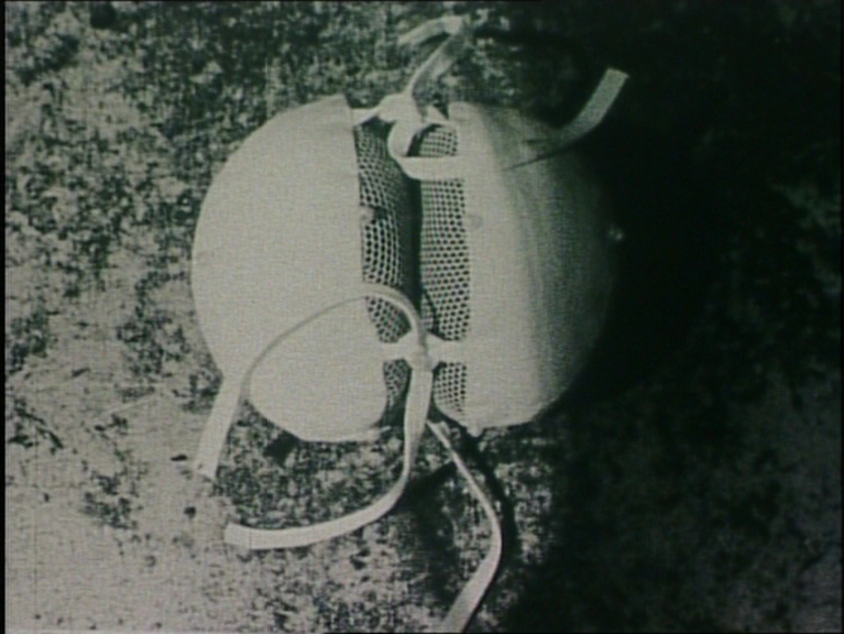 In der Dunkelheit wandert ein kreisrunder Lichtpunkt über eine weiße Leinenkugel. Es wird Licht auf- und abgedreht. Dann wird die Kugel außerhalb der Szene bewegt und der Schatten der Kugel bewegt sich über ein Foto der Kugel.