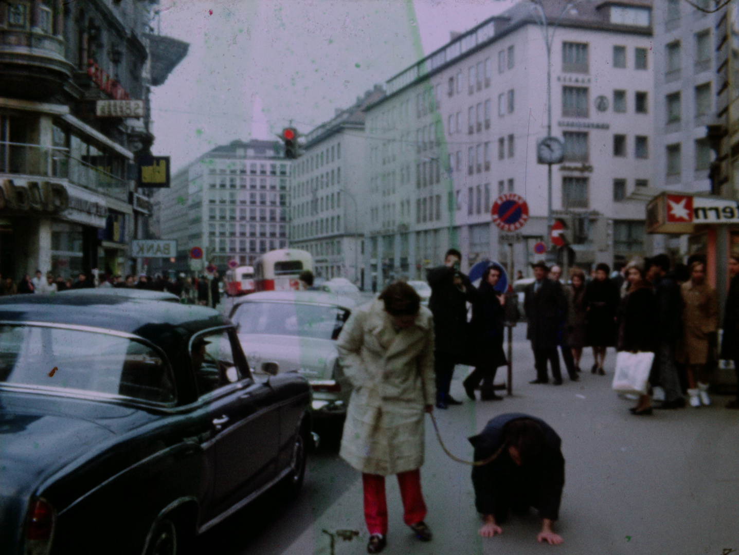 Aus altem Material montiert. VALIE (EXPORT) führt Peter (Weibel) an der Leine. Kurzer Film, der das nahende Ende (Trennung) erahnen läßt. (Ernst Schmidt Jr.)