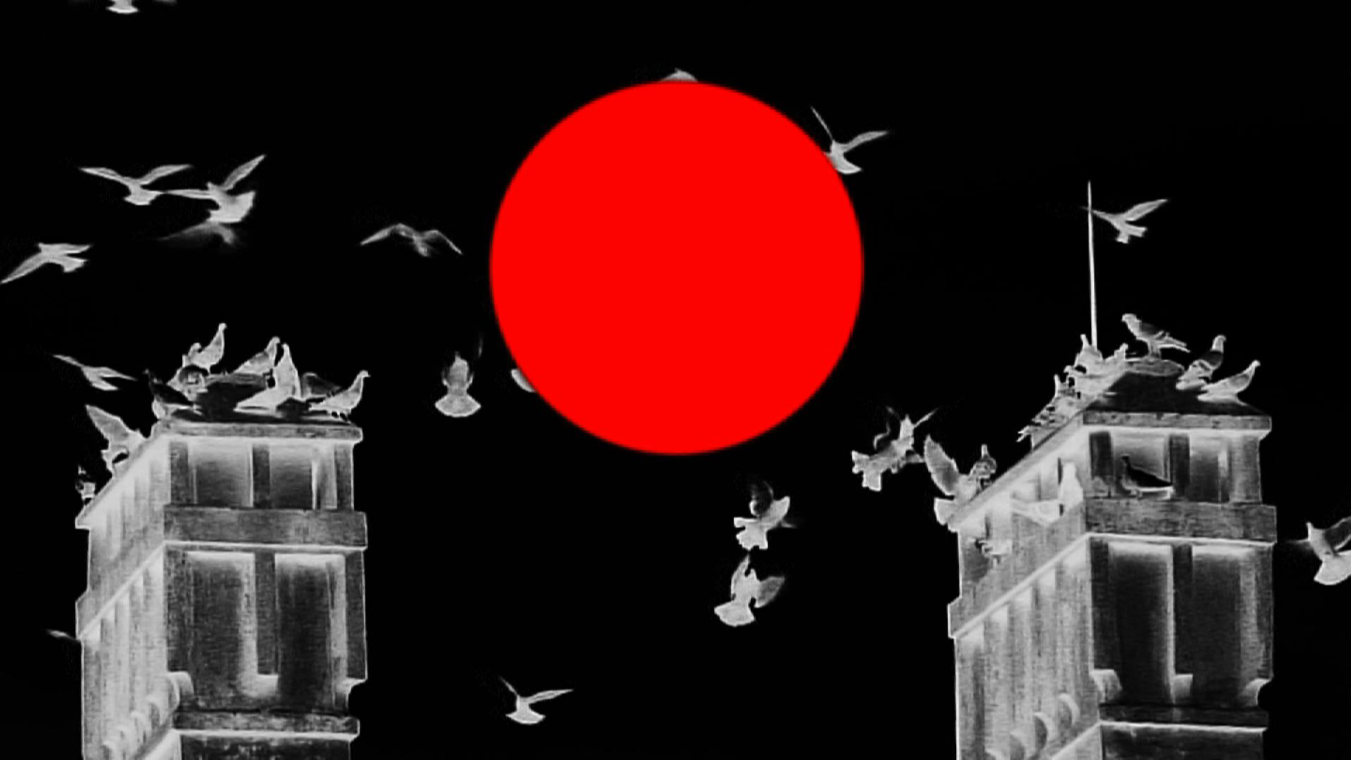 2012, an einen heißen Sommertag filmte ich, betont naturalistisch, diese Szene. Von Betram Hellermann-Fischerfilm ließ ich die Sequenz in ein nächtlich wirkendes schwarz-weiß-Negativ-Bild umwandeln und die große rote Sonne zwischen die Kamine montieren ...