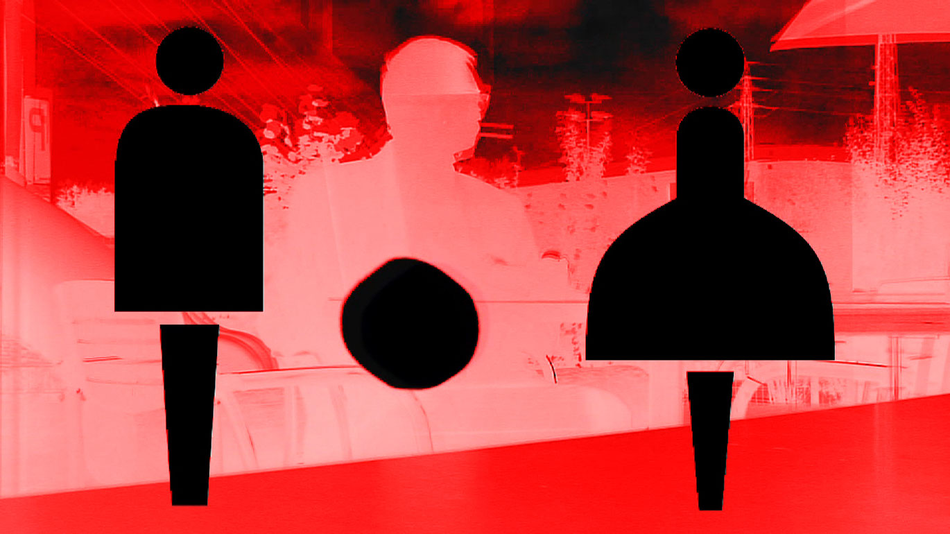 Lindach, Autobahnraststätte: Verspiegelte und invertierte Restaurantszene, in der ich einen Kaffee trinke und eine Chesterfield rauche, flankiert von einer männlichen und weiblichen WC-Figur und ein flackernder Lichtpunkt...