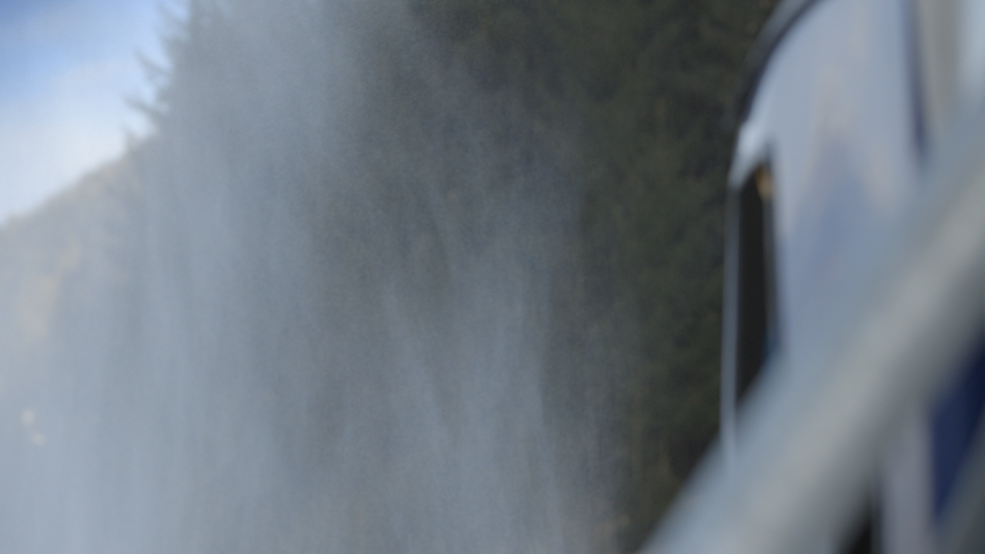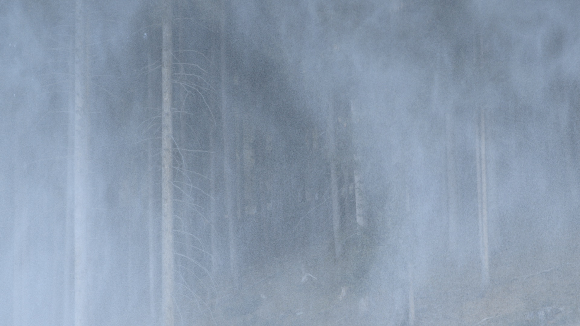 Durch Schleier aus Schnee schimmert herbstlich grünbraune Landschaft. Irritierend und seltsam zweidimensional, wie ein Bild auf einer Bühne, das den Hintergrund für den bewegten Dunstvorhang im Vordergrund darstellt. Starke Windböen wirbeln den Schneefall durcheinander, der immer wieder neue Strukturen annimmt. Schichten und Wirbel formen sich, Schwaden wie aus Rauch ziehen rhythmisch durchs Bild. Mitunter wird das Gestöber aus weißen Punkten und Linien so dicht, dass es an die Bildstörung eines alten Fernsehgeräts erinnert. Der Fokus wechselt zwischen abstrakt rauschenden Flächen und malerisch verschwommenen Waldansichten. Das bewusste Weglassen eines Tons, einer Atmo, verstärkt den Eindruck der Bühnenhaftigkeit und der Künstlichkeit des Naturschauspiels.