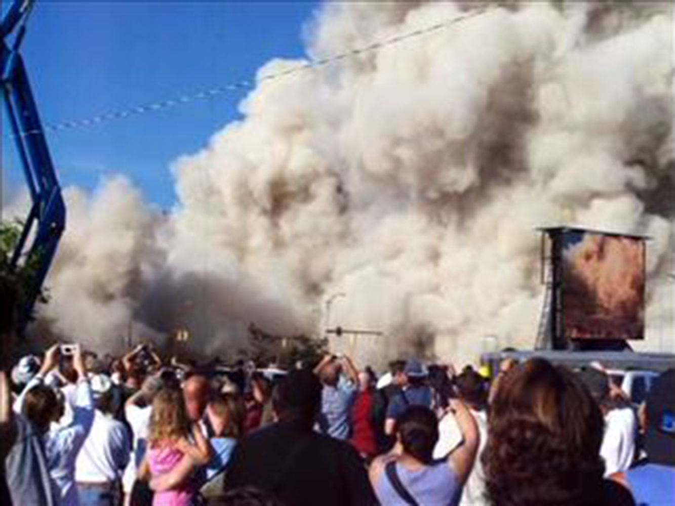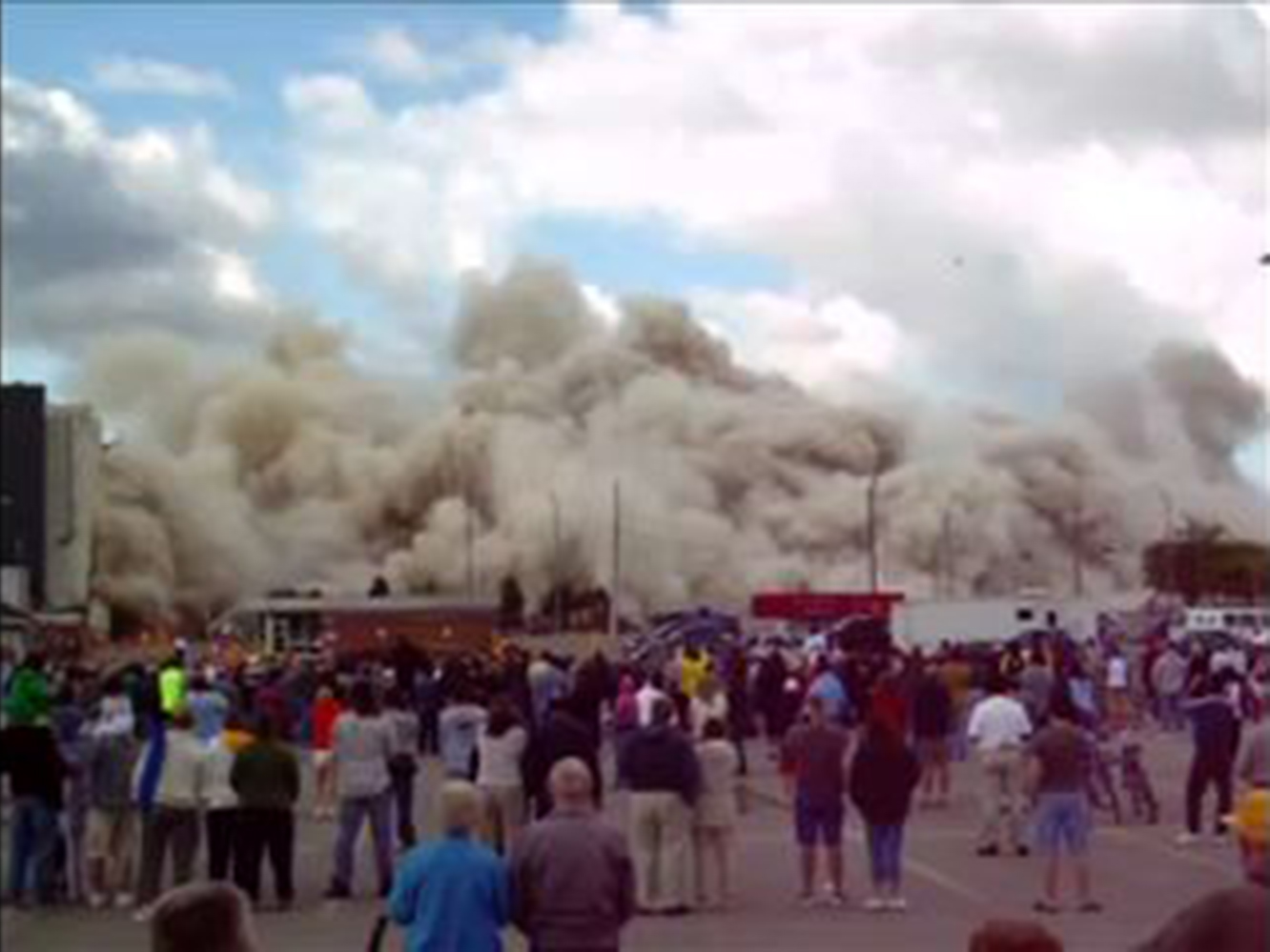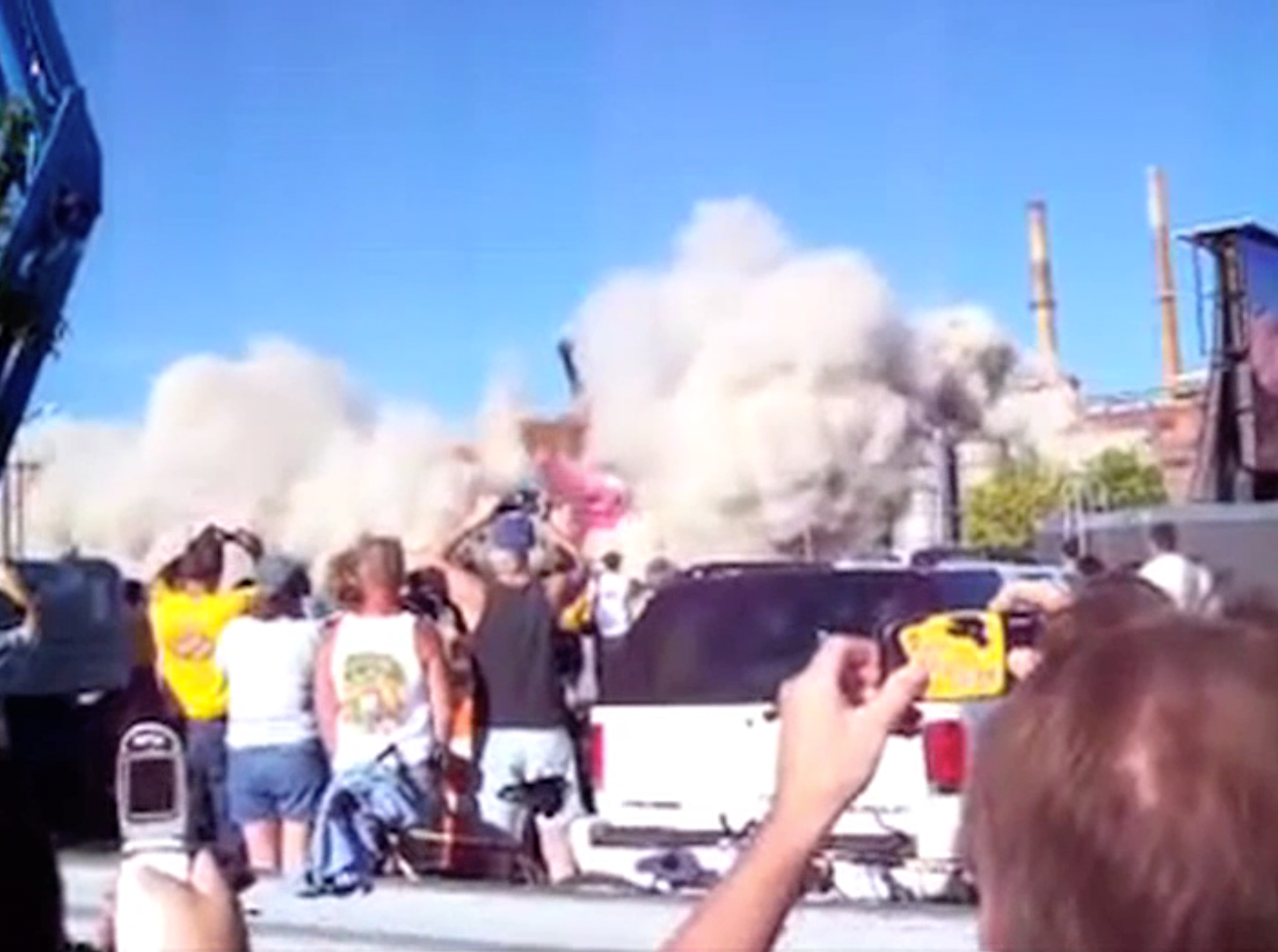 "Five...Four...Three...Two...One", skandiert ein älterer Herr ins Mikrophon. Das obligatorisch nicht laut ausgesprochene "Zero" des Countdowns ersetzt er durch eine dynamische Drehung des Oberkörpers nach hinten. Sein mitgeführter Fingerzeig provoziert einen Einstellungswechsel, der den Blick auf barockbauschige Staubwolken freigibt, die von einer schier unaufhaltsamen Kraft in das Innere des Bildes gesogen werden, aus dem sich unter Getöse ein imposantes Gebäude in seiner ganzen, unbeschädigten Pracht aufbaut. Aus unterschiedlichen Perspektiven und Entfernungen ereignet sich dieser Prozess insgesamt fünf Mal. Man fühlt sich an die legendäre Explosion zum Finale von Michelangelo Antonionis Zabriskie Point erinnert, allerdings mit einem entscheidenden Unterschied: Viktoria Schmid redemoliert. Ihr Arbeitsmaterial besteht aus Privataufnahmen von Zuschauer_innen, die der Sprengung von Gebäudeteilen des Eastman Kodak Firmenkomplexes in Rochester beiwohnten und ihre selbstgefilmten Doku-Clips auf YouTube veröffentlicht haben. Viele von ihnen haben in der Fabrik gearbeitet und sind so Zeug_innen der Zerstörung ihrer ehemaligen Arbeitsstätte. Viktoria Schmid kompiliert die Clips und spielt sie rückwärts ab. In der reversiblen Bewegung gerät die Implosion zur Festsetzung. Und so formt sich das In-Schutt-und-Asche-Legen der Gebäudeteile zu einem spektakulären Wiederaufbau, begleitet von erstaunten Zurufen des Publikums ("WOW" lautet das Palindrom des Moments!). So wird dem gloriosen Auferstehen der Fabriken des farbsensiblen Analogfilms durch digitale Mittel ein Denkmal mit Partycharakter gesetzt. (Melanie Letschnig)