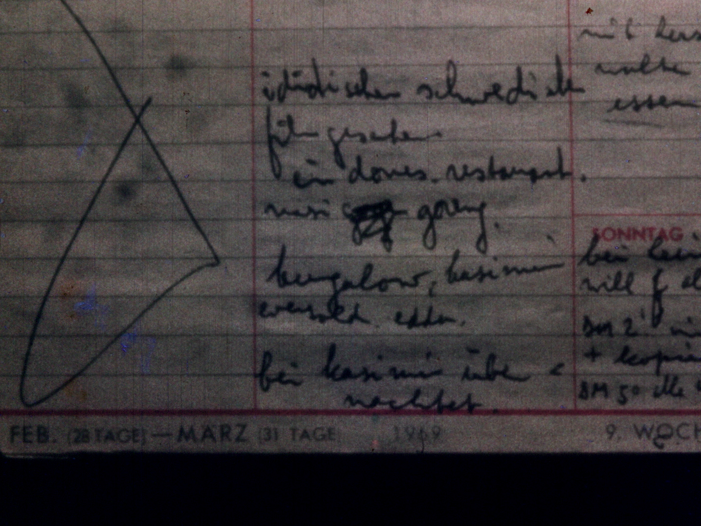 In 34/76 Tschibo filmt Kren seine Kaderpartituren, Aufzeichnungen, Notizen und Tagebucheintragungen ab und unterwirft sie seiner Methode des seriellen Kurzschnitts. Die Schriften geben sich als stumpfe Zeichen zu erkennen und haben alle Bedeutungskraft verloren, sind in der Zeit nicht mehr zu lesen, nur mehr Erinnerungsfetzen, wie beim schnellen Durchblättern eines Kalenders - Daumenkino der eigenen Filmographie.