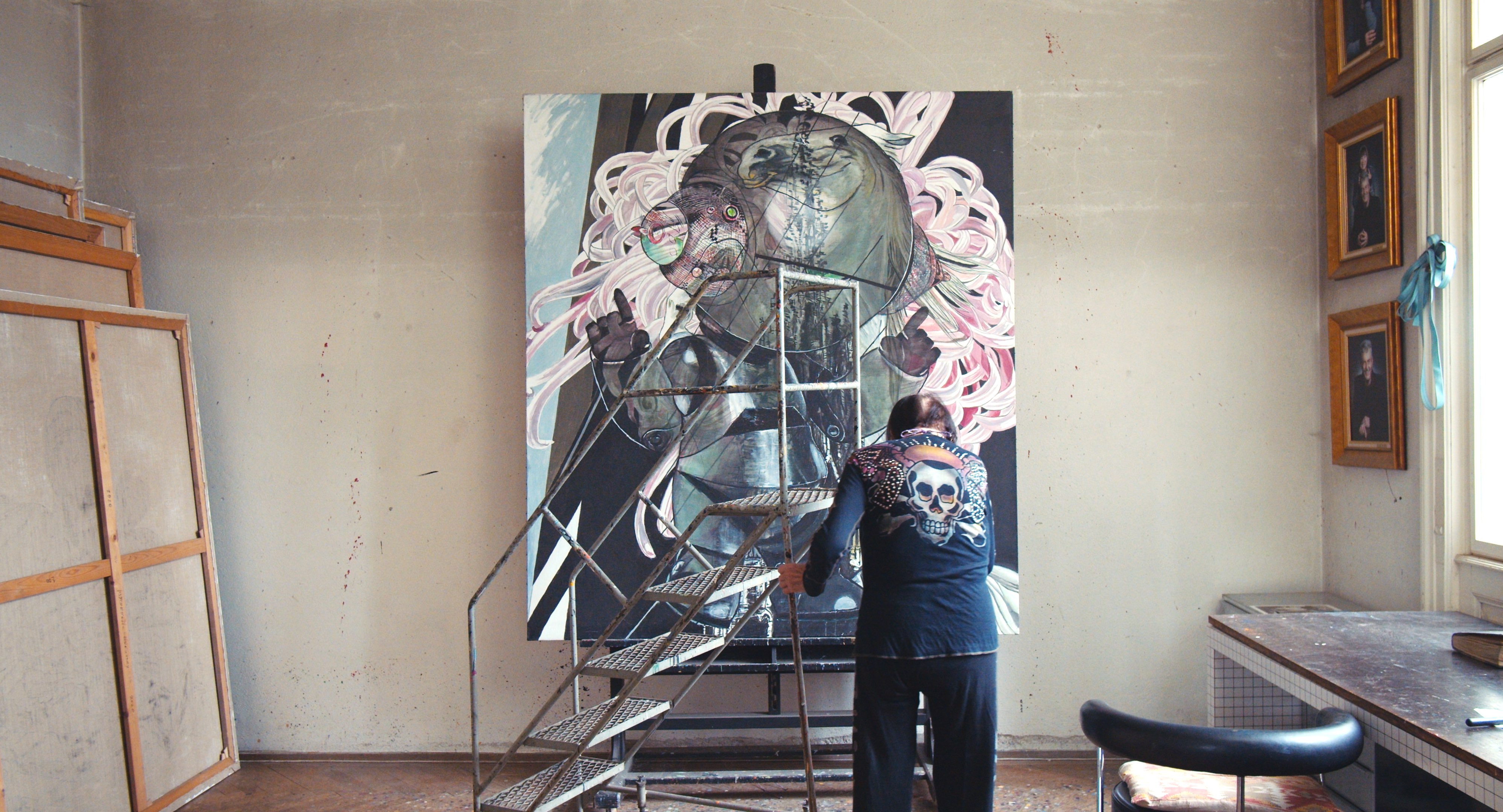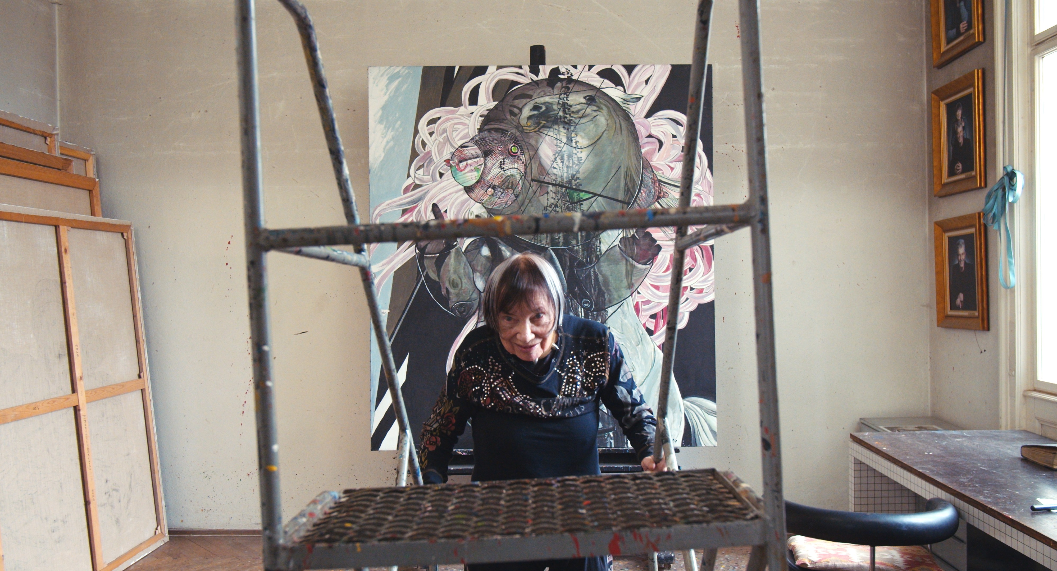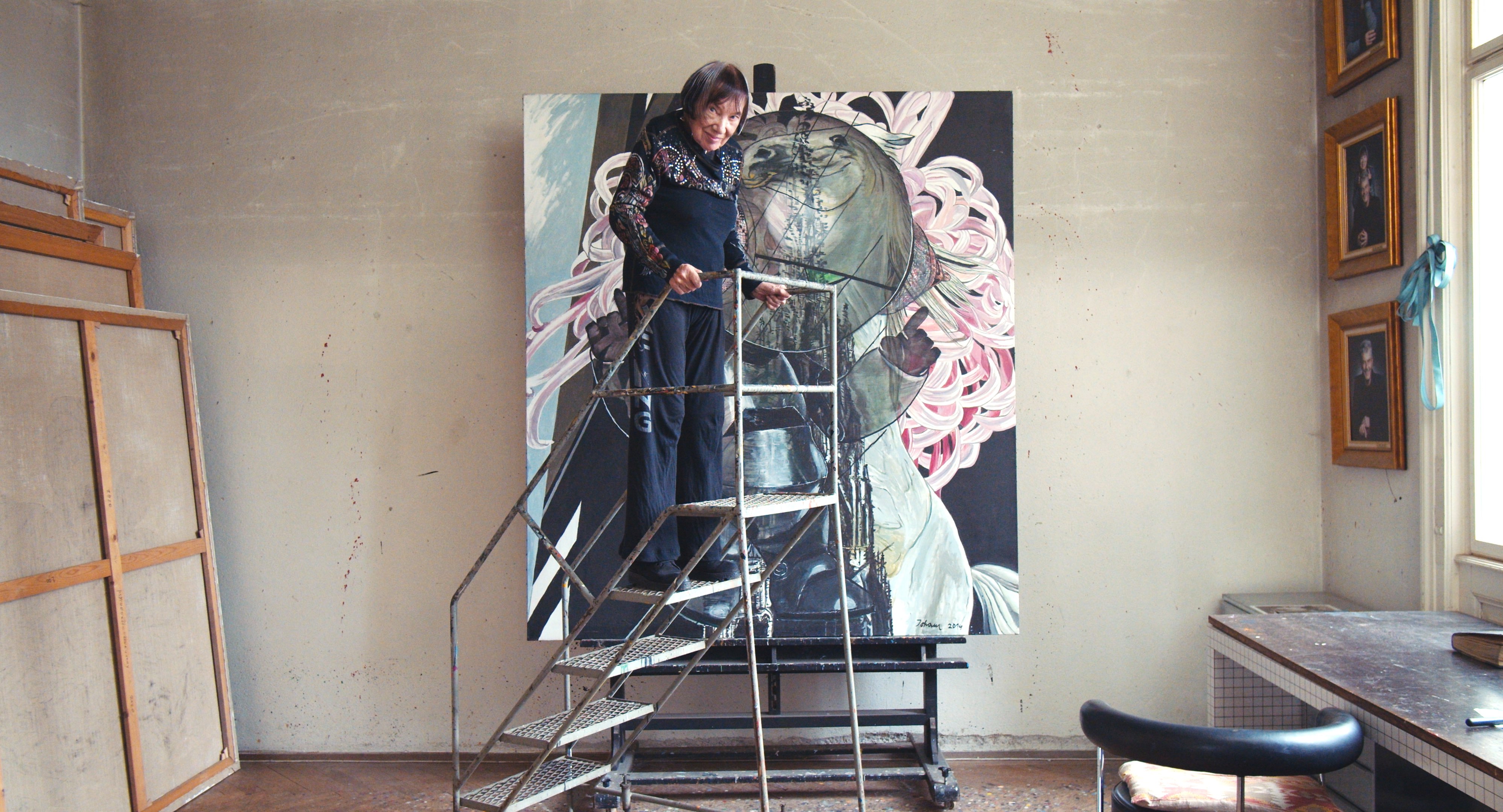 Isolde Maria Joham – die Frau im Bild – steigt auf ein Rollgerüst. Ganz sachte nimmt sie eine Stufe nach der anderen, bis sie fast ganz oben steht, dann streckt sie ihren Daumen hoch und blickt verschmitzt lächelnd in die Kamera. In streng kadrierten Bildausschnitten zeigt Christiana Perschon die 90jährige Künstlerin, wie sie dieses Gerüst performt, immer wieder durch seine Verstrebungen hindurch in die Kamera blickt. So zart und zerbrechlich Joham wirkt, sosehr beherrscht sie noch immer dieses Werkzeug, mit dem sie in all den Jahren umzugehen gelernt hat. Ihre Gemälde sind auch noch da, jedoch im Hintergrund. Sie umfangen die Künstlerin und ihr Gerüst gleichsam als zweiter Rahmen – den dritten bildet die Kadrage Perschons. Dabei kommt es zu wunderbaren Überlagerungen und Korrespondenzen zwischen der Künstlerin und ihrem Werk. So wird sie etwa einmal beinahe zu jenem Roboter, der metallisch und doch fragil hinter ihr ein Feld von üppigen Blumen durchwandert.