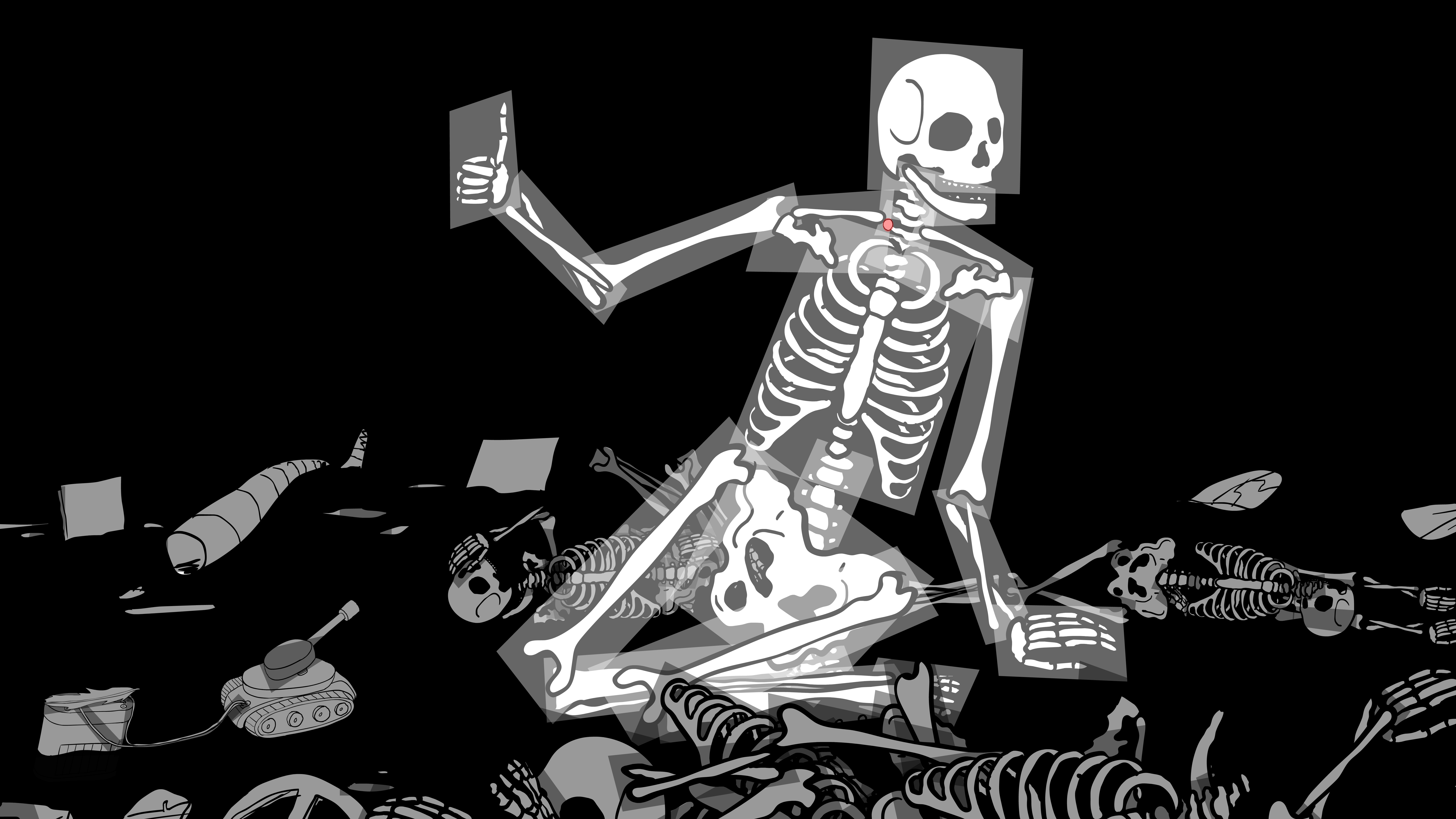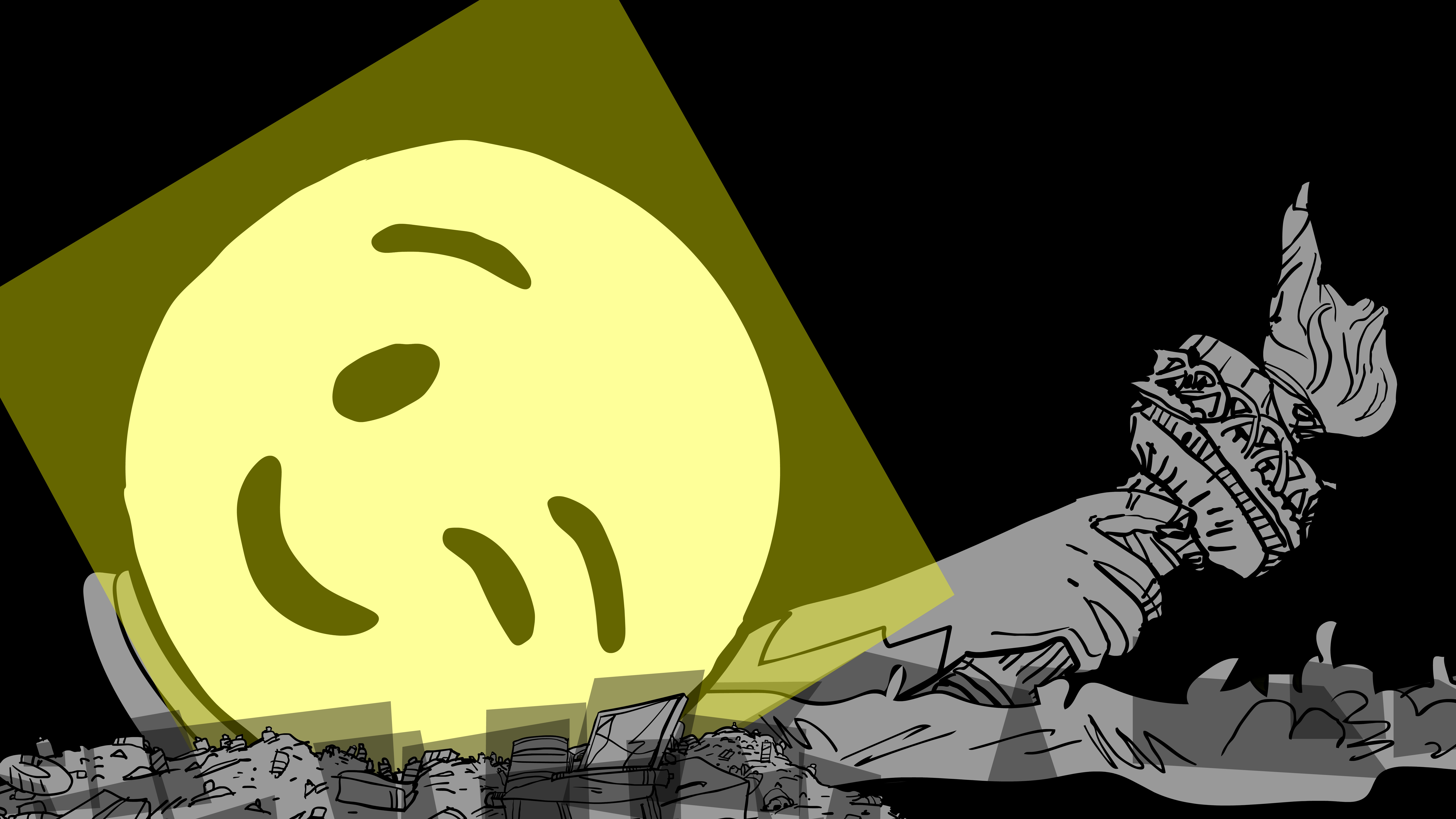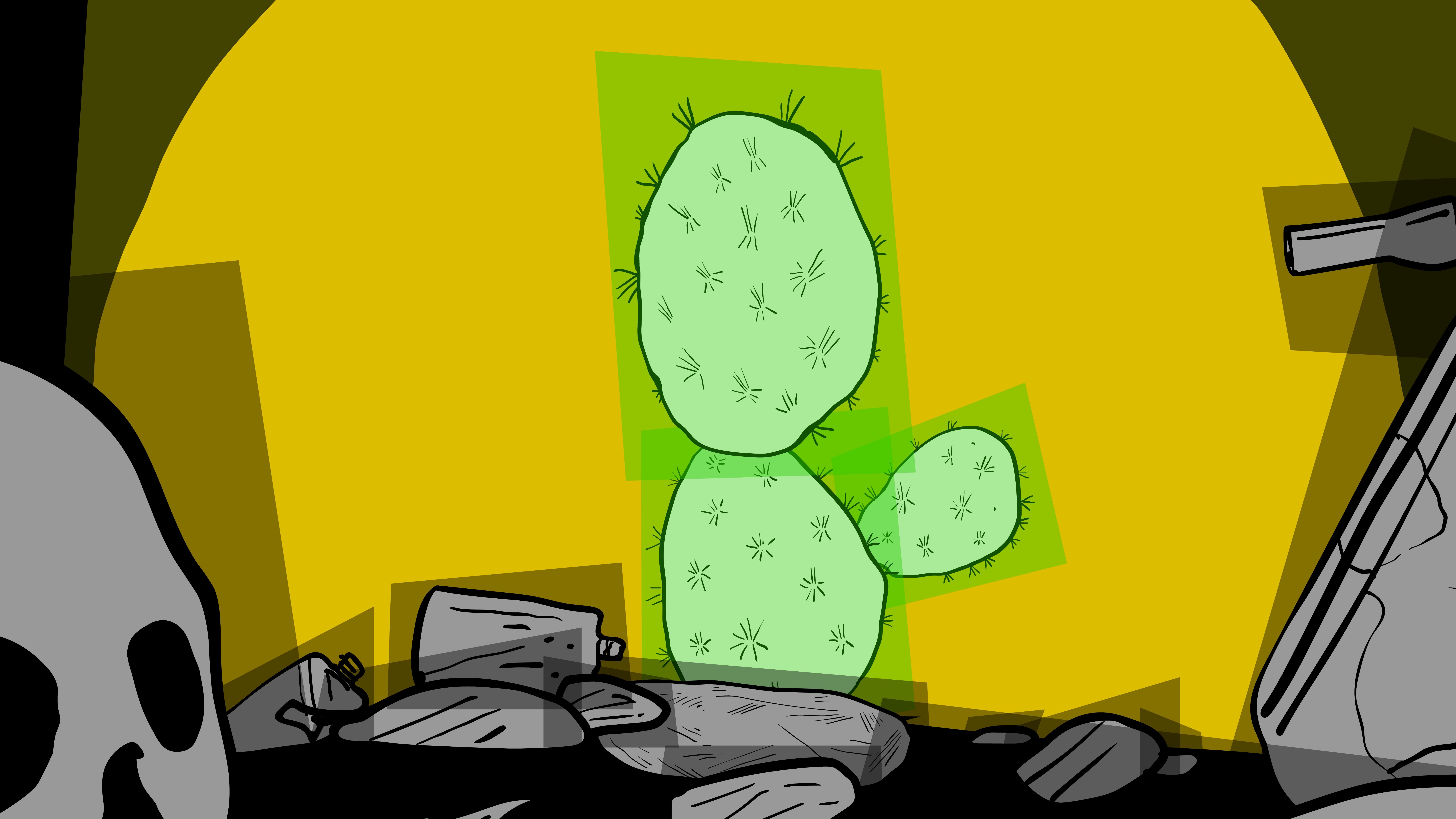 Die Welt zieht vorüber, sie ist kaputt. Die Umwelt, die Häuser, die Infrastruktur und die Menschen – ein postapokalyptischer Streifzug, der immer noch Gegenwart ist. Schilder mit Phrasen wie „Zurück zur Normalität“ oder „Früher war alles besser“ werden von zusammengeklappten Skeletten gestützt. Und sie erinnern uns – insbesondere im Fall der zweiten Behauptung – daran, wie hohl und ungebräuchlich diese Floskeln schon immer waren, wie ahistorisch und undifferenziert, wie – mit Ernst Blochs Prinzip Hoffnung/Kapitel „Die neumodischen Dinge taugen alle nichts“ gesprochen: abergläubisch. Dann geht in Leopold Maurers Animationsfilm CATASTROPHE die gelbe Sonne auf und initiiert einen Rube-Goldberg-Maschineneffekt, der von einem Kaktus über das Konterfei des amtierenden US-Präsidenten bis zu einem Münzsparschwein reicht und irgendwann gibt ein Plastikquietschentchen den Anstoß zum Umsturz.