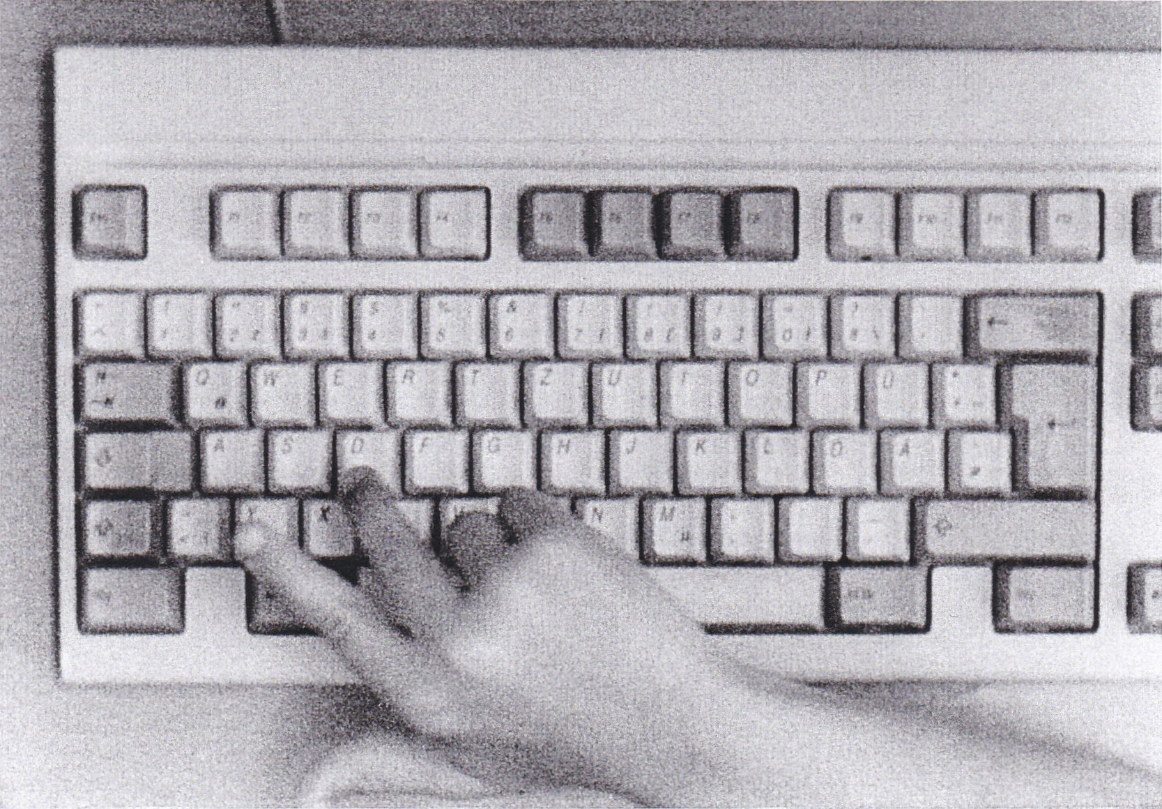 Gerald writes letters, syllables and words on the computer. Finally he writes the sentence "The ship sailes over the sea". Something which is taken for granted, a hand on a keyboard, is experienced as a challenge.