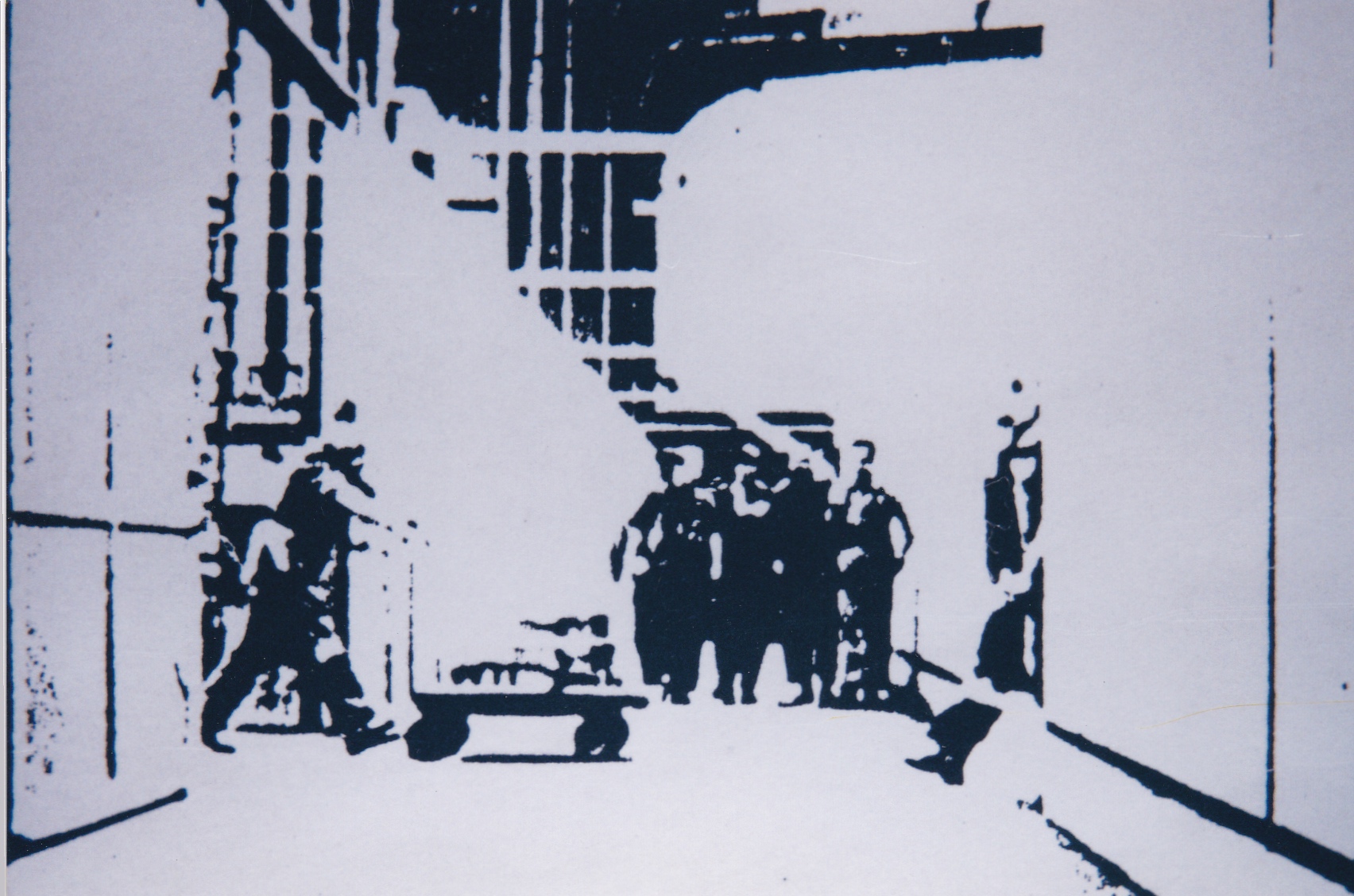 The initial image is transformed into almost abstract black and white surfaces, harnessed, Sisyphus-like, to a lunatic dance of repetition. Fruhauf increases the acceleration of the striding workers in discrete steps until they are tearing along - the capacity of the film tested to its outer limits - until it can´t take any more. Maximum acceleration leads to stasis - after the acceleration throughout the film comes the logical consequence - the last frame - the freeze frame. Nothing more can happen. The model (literally) of progress collapses. And instead there is paralysis. A dead end. The workers are motionless, and with them the factory.