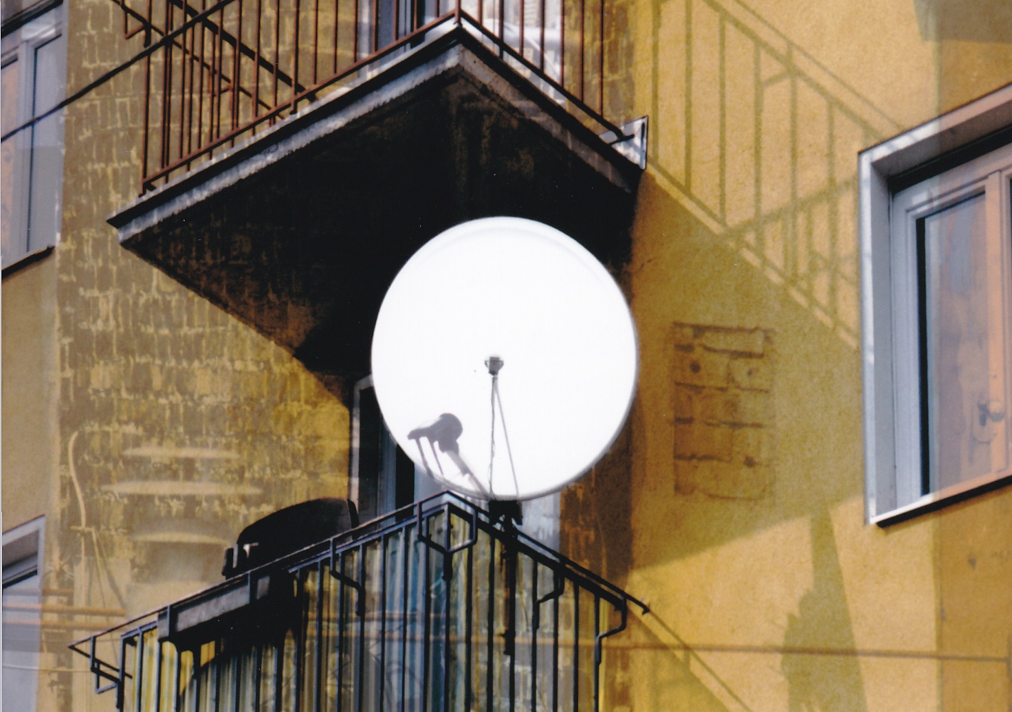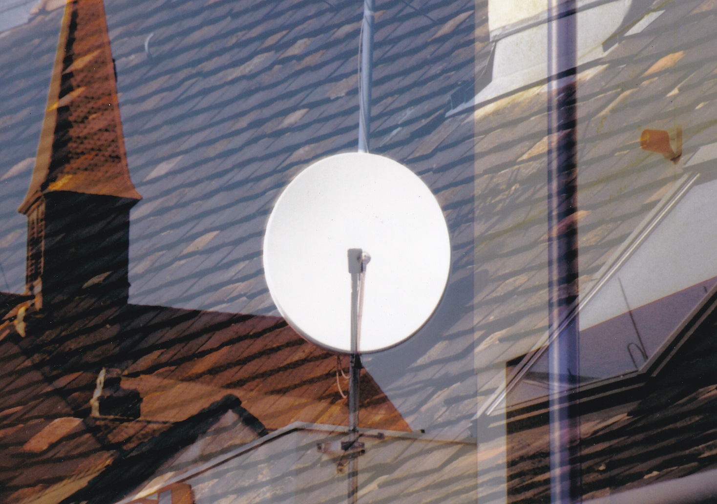 The senses do not receive information from the body´s own organs. All reflections dealing with the function of the senses return to this empty space: How to see seeing, how to hear hearing, etc.? In 1668, Edme Mariotte attempted to find out and discovered the "blind spot" in the center of the field of vision, which is the spot at which the central optic nerve is connected to the eye. The thing which allows the eye to see (ultimately the brain) is itself blind. The centerpiece of Parabola, literally at the exact center of the image, are parabolic antennas, commonly termed satellite dishes. They bring, as it is often said, the world into your living room, or at least that part of the world which can be made visible (which requires more than eyes or cameras). These antennas themselves usually remain "invisible", edited out of everyday perceptions as constantly recurring elements. On the whole, they would be relatively uninteresting if they did not give structure to the image as formal elements. The viewer can then see what they are concealing, and they provide a perspective which determines the image´s dimensions and the focal length (the parabolic mirrors appear in the center of the frame and are always the same size). They add an unreal quality to the reproduction of reality (Watzal´s video consists primarily of slow superimpositions of various photographs) and take them back to an image, a performance of planes, shapes and colors. Interesting. (Vrääth Öhner)