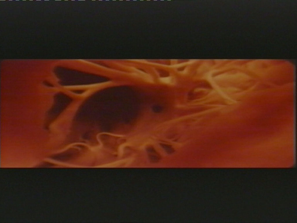 The surgeon with severely slicked-back hair, who talks into an intercom and then to himself in Swedish before dissecting the meat, creates a somewhat odd impression, in particular due to the curve of the "fake" wide-screen image. But the unusual object being fiddled with (or maybe not) by this sleek mad scientist reminiscent of B movies, Cronenberg and the Kingdom clinic is even more enigmatic. As a result, its visibility is at the same time legible, decipherable, for example as a jiggling, affective red which would overmodulate any video monitor filling out the structure of the meat¹s tissue. Or as a red galaxy fading into the microscopic detail of a foreign body. Seen, heard and read in a synesthetic sense, the zoom into the amorphous body corresponds to the pathway taken by Bernhard Fleischmanns chords and percussion through an inconstant blubbering, crackling, creaking and splashing. The regular contours of the music seem to take their pointed warmth from intimate contact with the meat (the open heart). Considered in light of synthpop history, the video operates in a gray zone and investigates the unknown: The The. An ingrowing edible rhizome - rhiz for breakfast. (Drehli Robnik)