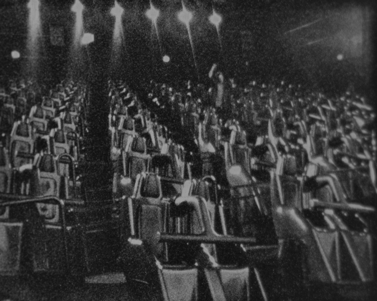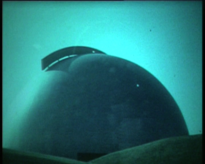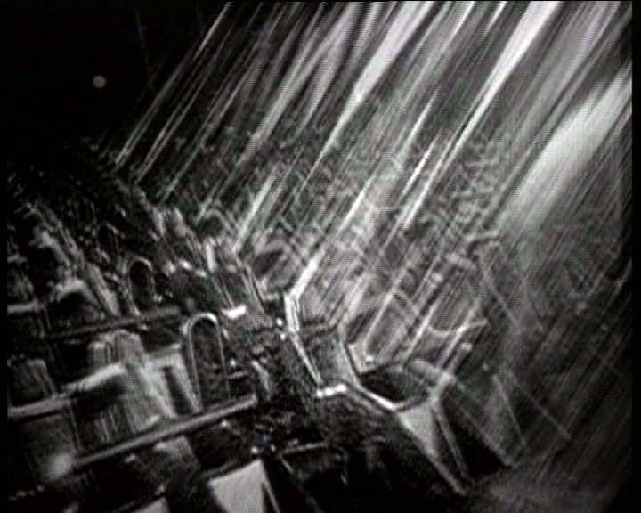 Entrée is a reflection on the fusion of viewer and visual world in hi-tech cinema locations. The raw stock of the videotape is grainy film footage shot in the Parc d'image in Poitiers :the spherical and crystalloid monumental architecture on green fields, oversize screens and dark arenas reserved for audiences. Originally representational in character (with a brief glimpse of the title-giving Entree to the futuroscope), the footage is fragmented through digital editing into abstract visual elements.Multiple visual echoes, double images and the industrial staccato of sound samples on the soundtrack represent the technical subsumation of people subjected to the diktat of a robot-controlled event machinery that consigns the viewers, unconsciously, from one experiental world to the next, and causes them ultimatly to vanish in the process. (Reinhard Wolf)