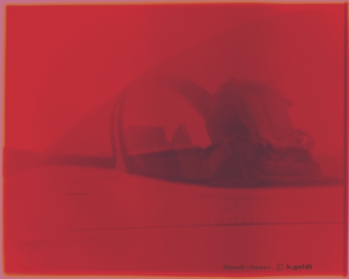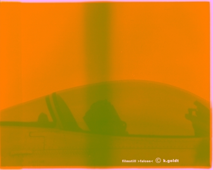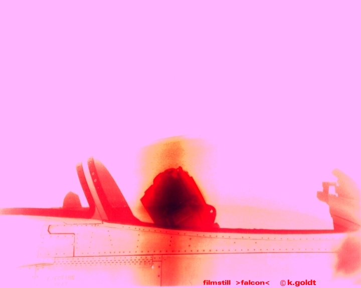 An orangeish-red field of colour with a graphic which is not immediately recognizable, accompanied by the soundtrack´s electronic fields: falcon begins with a static and visually arresting image which is soon transformed. The colour turns to white and then pink, yellowish green changes to orange and red. This takes place parallel to the vibrating soundtrack. Parts of images are affected by these colour modulations, resulting in various degrees of intensity. Only gradually does it become obvious that the strange symbol is the abstracted picture of a jet´s cockpit: Falcon is both a bird of prey and the name of the F-16, a jet fighter.