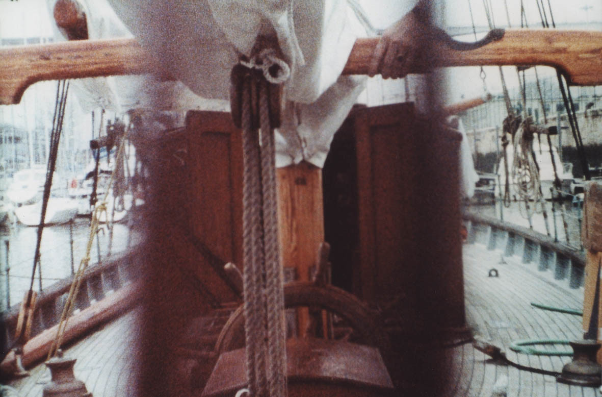 At first Kerstin Cmelka dissects a view of a sailboat tied up in a harbor. Using masks, three vertical segments of this scene are exposed from the same point-of-view at different points in time, and for each exposure the film strip goes through the camera at a different speed. As a projection, a "whole object" seems to appear, though a number of distortions are evident. Not only that the boat rocks unevenly with the water´s motion, the camera on the pier moves gently and constantly from side to side. The varying speeds of the individual segments produce a convulsive, accordion-like movement which oscillates somewhere between wriggling and almost complete motionlessness. The concrete object in front of the camera´s lens thereby withdraws from actual perception; what remains is a composite image of an object in various states (and types of motion) which is concentrated on the simultaneity of these snapshots´ non-simultaneous elements. As a result, the synthesis of the image first seems to take place in the soundtrack at first, a constant creaking of the lines and the boat´s rigging. In the moments when part of the visual triptych is replaced by a black frame, the corresponding portion of the background noise also goes quiet, revealing that the acoustic aspect is a construction in rigid synchronicity with the matching image sections.