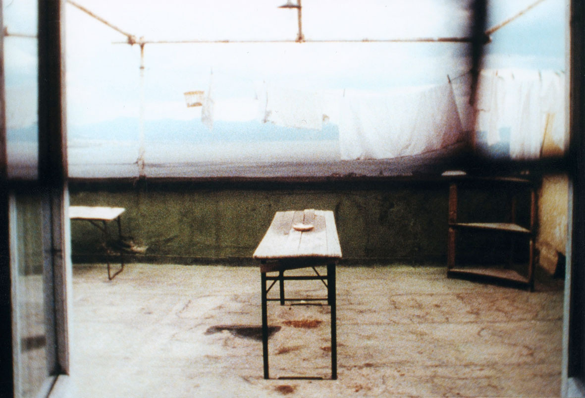 The first tableau is thoroughly inviting: It creates the impression that the viewer is on an open terrace in summer, with the sounds of traffic coming from far away, laundry hung out to dry and the sea, sky and clouds visible in the distance. In fact, the space which is shown is anything but open: Being composed of three different shots, it can exist inside the camera only. Our gaze is limited by images transformed into walls, as if the screen had suddenly become a camera obscura.