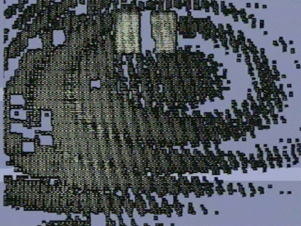 cool, delicate geometric figures bathed in light blue-gray, cautious colours after the postulated end of retinal art: the angular and briefly flickering reticence, both light and dark grayish blue occasionally dominated by white, square and rectangular shapes colliding with irregularly shaped blots of colour, a cautious inundation of movement, an apparent attempt to make everything else disappear. menacing or conciliatory cloud formations, caterpillar-like arches which are reminiscent of turner’s heavens. eruptions, golden, dark gray or tinted black, pour over the peaceful, barely glimpsed goya-gray; the clear, quiet primer pours over subdued shades of blue at an indecently gradual pace. distant constellations flare up, revealing how close the distance is. the only elements which permit the eye to rest attempt to meld, no, not meld, not merge but unite with extroverted restlessness; these two elements remain separate, watch each other, approach and then turn back, each keeping the other in sight. the same is true of the sound and picture, the video images and music: fusions and separations. their insistence on maintaining separate identities, independent, stubbornly willful and shot through with the desirous persistence of their approach,