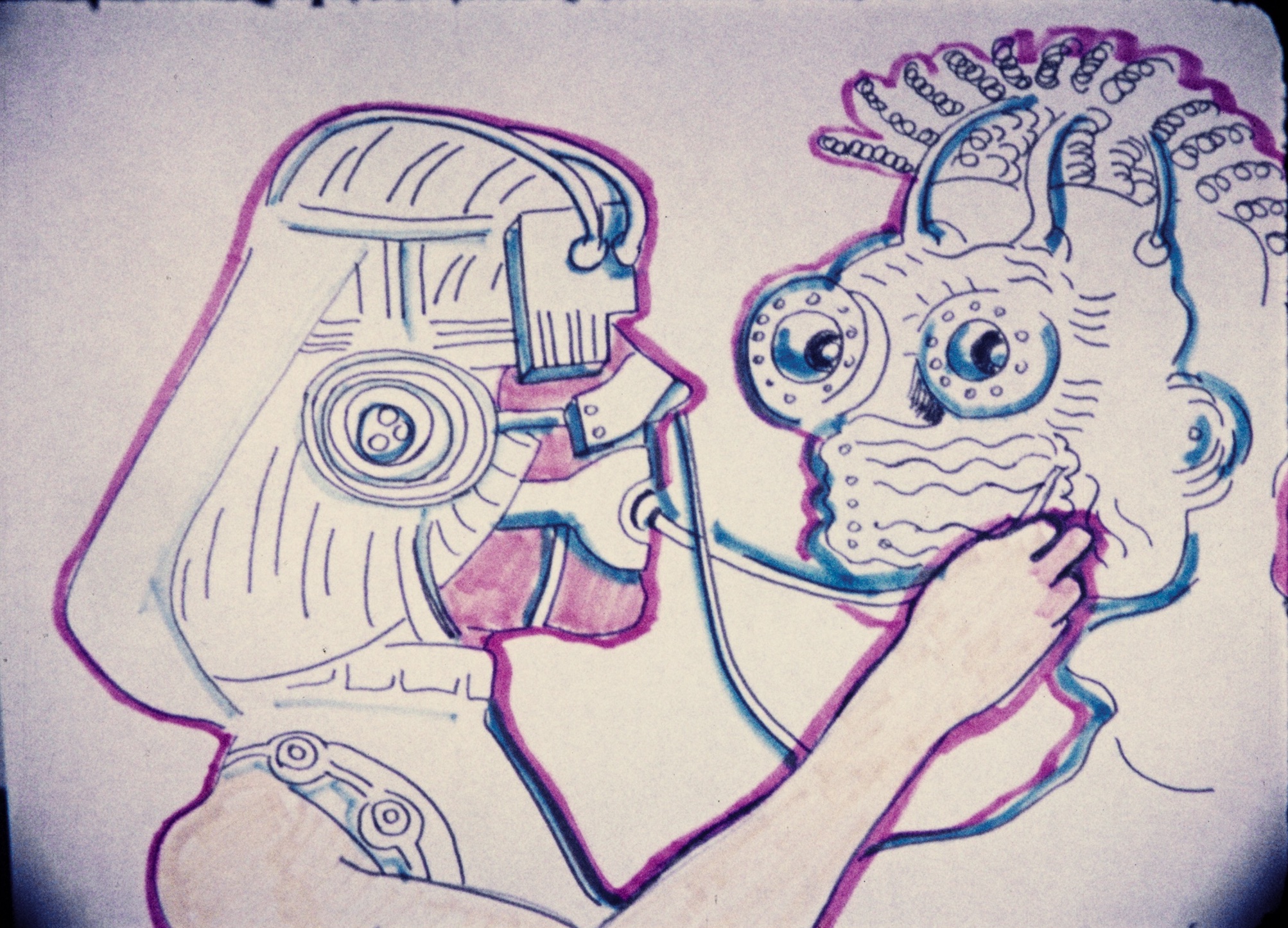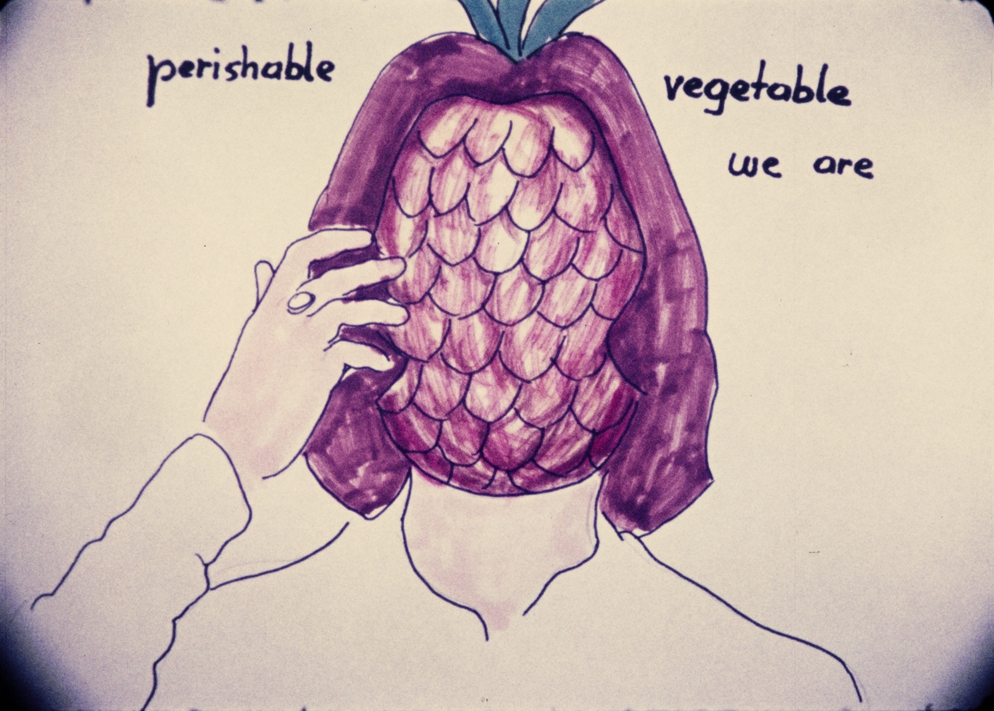 Lassnig, or more precisely her head, drawn with felt-tip pen, sings in English with a heart-rending Austrian accent about her life, her dreams, her eternal search for a male partner: "To look for the better half." But whenever one which is suitable with regard to color and shape appears, he calls her "weak" and "woman" in the same verse.