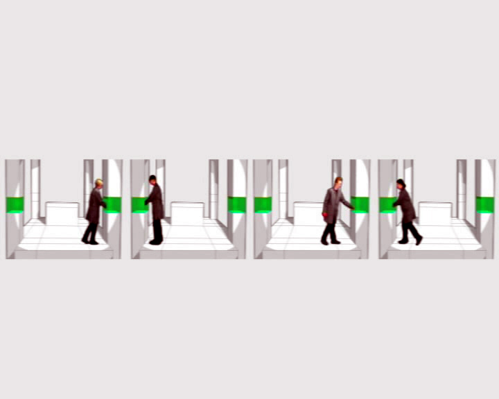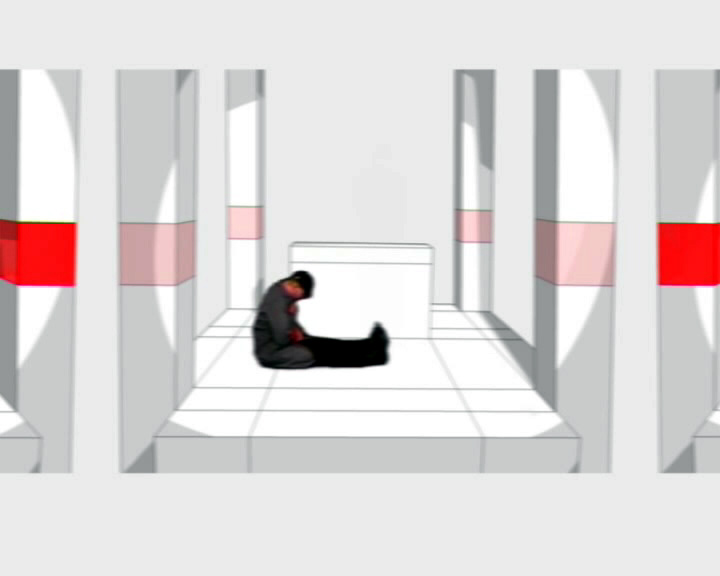 A vibrating line on a white background, which scans across the computer-generated plane. The soundtrack also suggests disquiet. Stretching, distorting, tearing breakage. What had begun as an abstraction is transformed into animation.