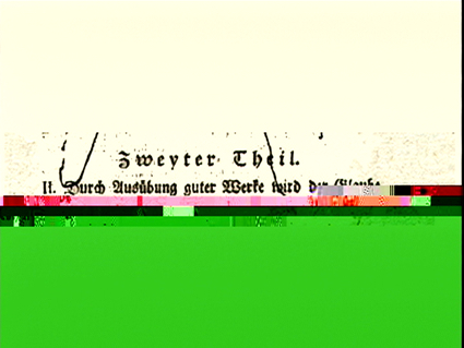 reMi has rummaged through the visual reservoir of Europes intellectual history, stopping in the early years of printing. In the sudden appearance of pictograms and the sound of Latin litanies, the past is quoted and identified as Christian and Western. Drawings with religious connotations, skulls, baroque images of saints, fragments of texts. Cultural products whose creators were obligated to a truth which cannot be relativized. S. Aug is visible at one point. Saint Augustine completes the conditioned mode of thought confidently. Obsolete assurance of a certainty, which has become suspicious in the same way as the motto: The truth is victorious. (Stella Rollig)