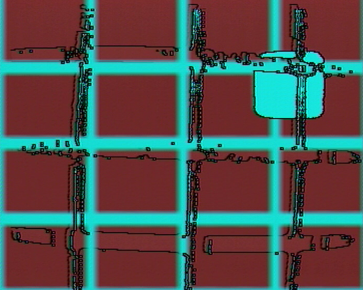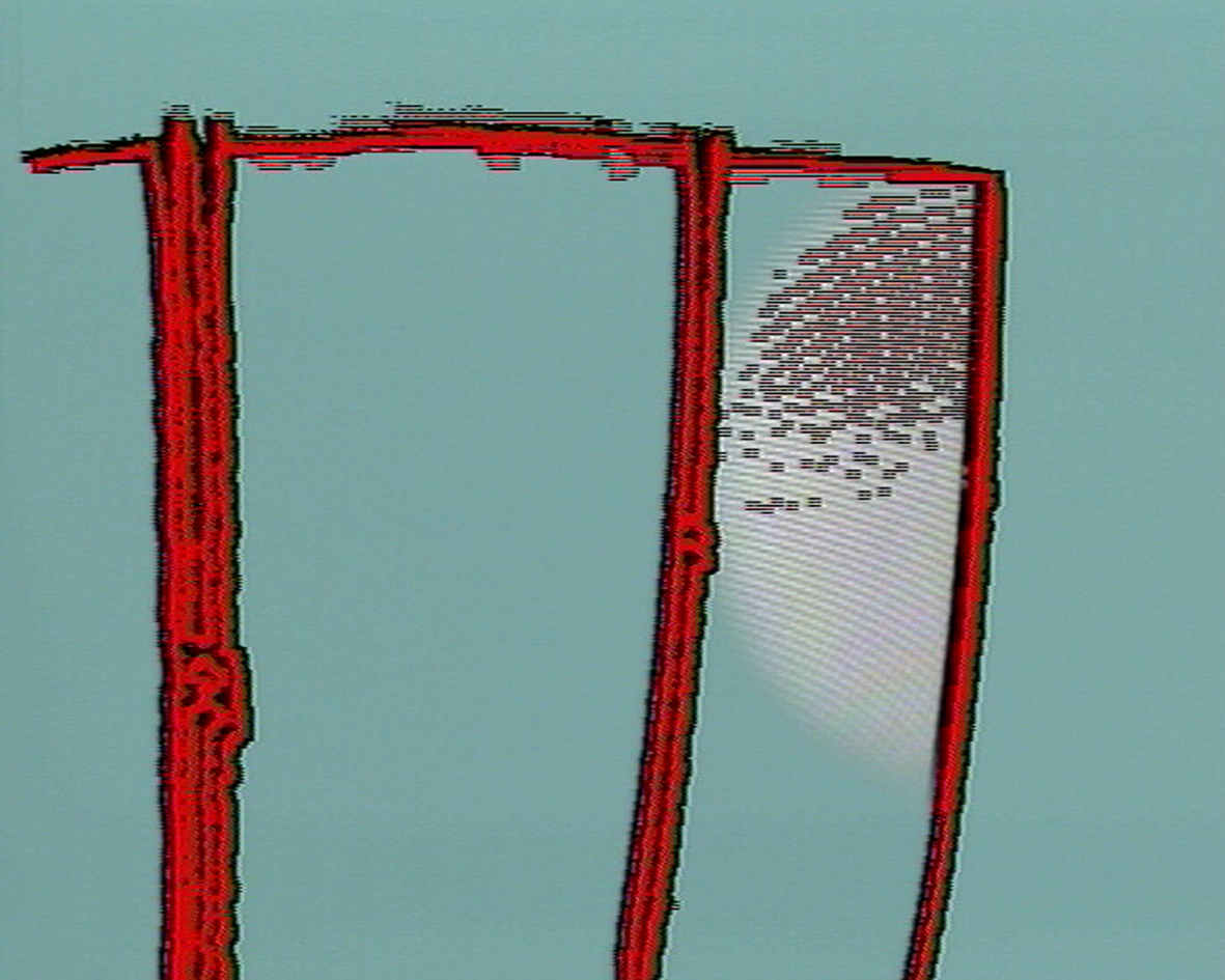Une « image » apparaît : par sa rigueur constructiviste, elle fait penser à un tableau de Helmut Federle. Un rectangle central, blanc, aux bords flous, placé sur un fond vert, par devant un polygone organique aux contours noirs tremblotants. Très lentement, le polygone amorce un mouvement, se mettant à danser autour de lespace blanc immobile. Portée par des sons discrets, la forme du premier plan se métamorphose, se décompose tandis que son rayon daction acquiert une apparence de plus en plus nette : celle dun carré. Un objet géométrique compact se transforme en un espace qui, avec des mouvements de plus en plus rapides, semble vouloir raconter une histoire à la façon dun dessin animé, pour finalement finir en carré rouge monochrome devant le rectangle blanc à larrière plan.