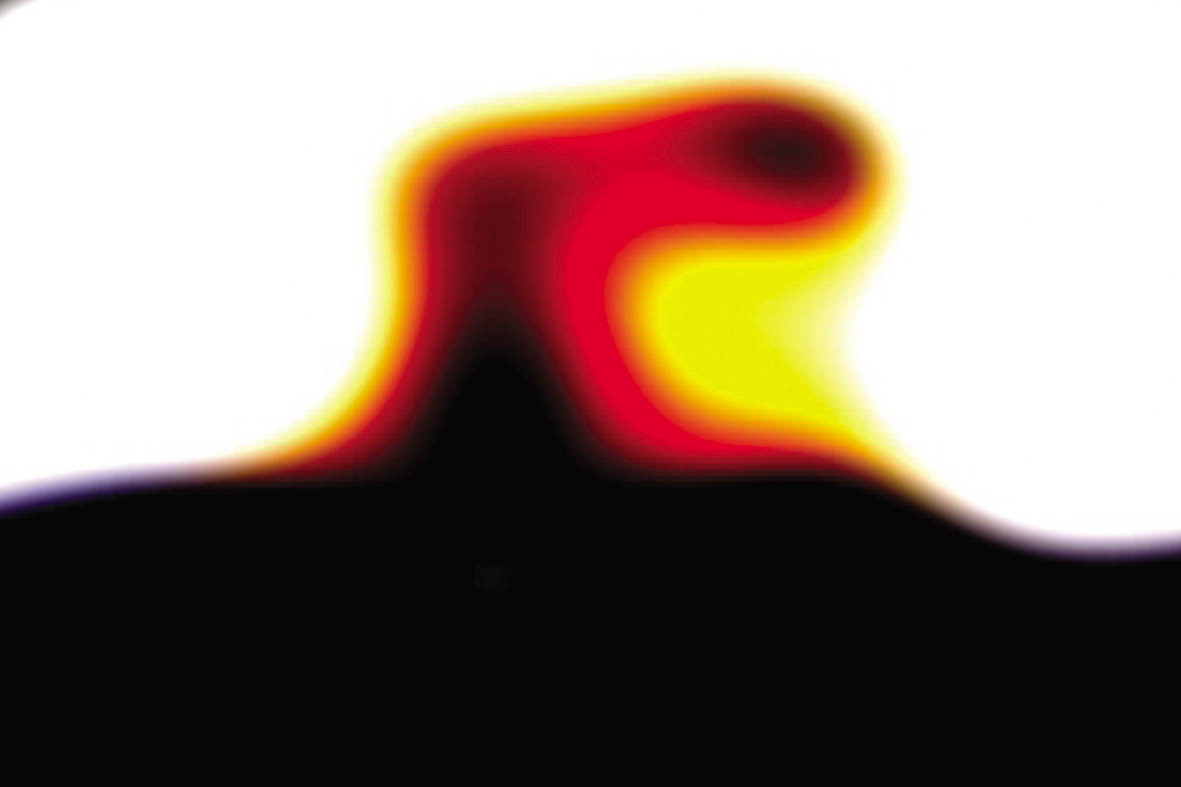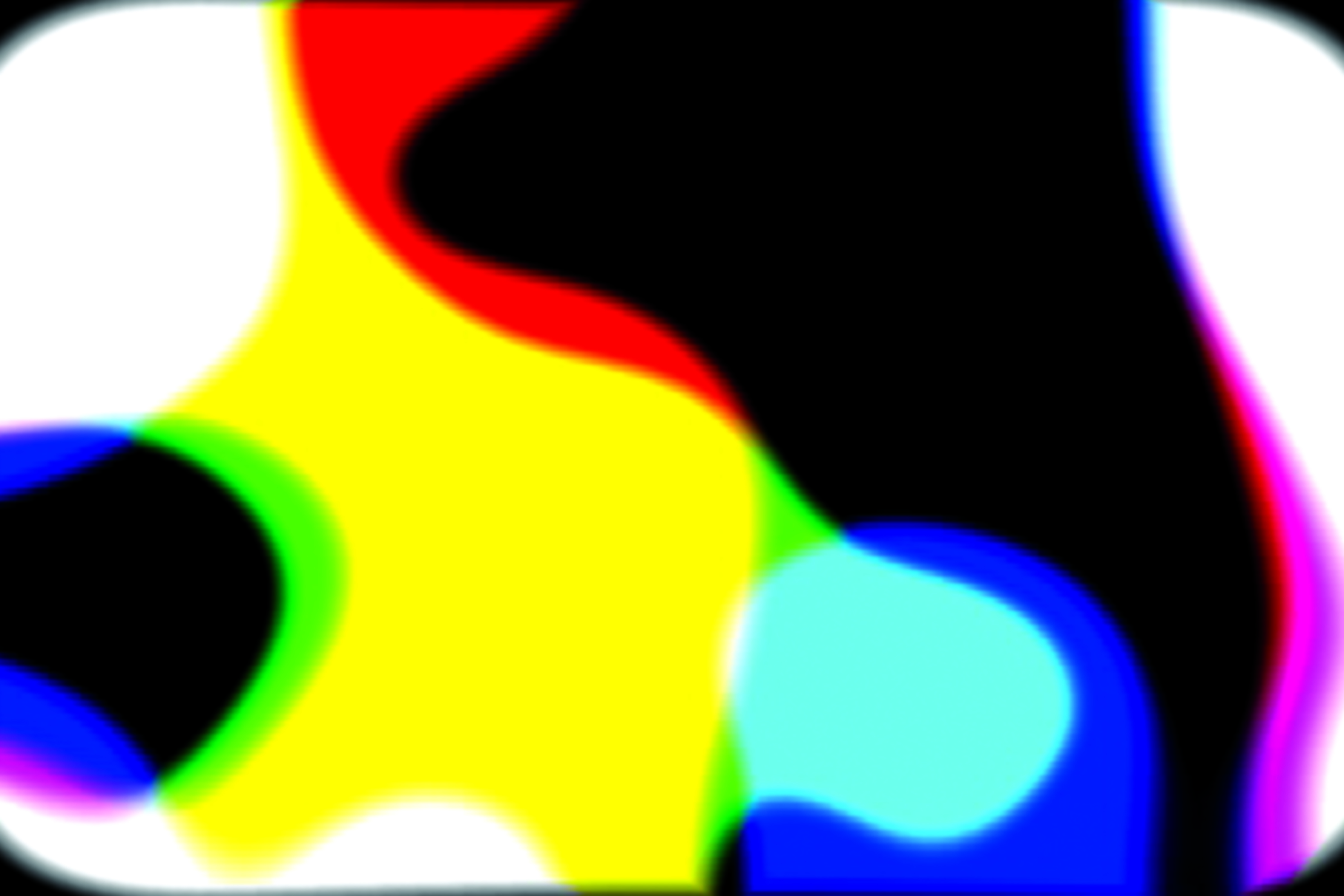 as masses of abstract surfaces, which show peculiar spots of colour all in the red-green-blue range. The surfaces, bubble-like formations, are turbulent, rhythmic; they "dance" to an underlying electronic sound field of crackling noises. The visual reality´s new state is fluid, amoeba-like. The "inner" work on the objects, however, is incomplete, or unclear; the vibrating bodies push beyond themselves and in the end the objects once again return to