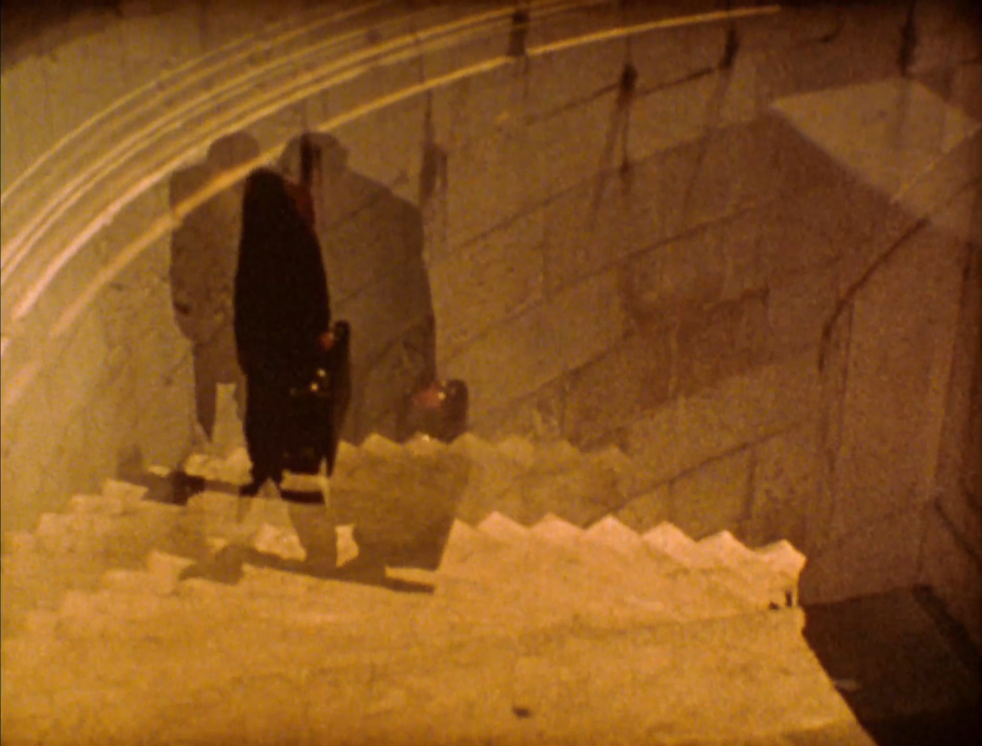 The film´s narrator is introduced as the silhouette of a man shown straining to climb staircases that fade into one another. He signs his name in the hotel ledger of Pensão Globo, unpacks his suitcase and prepares for his imminent death (the commentary assembled by Müller from recordings of an HIV patient leaves us in no doubt about this). He is accompanied by the ghosts of his past, who may have fallen victim to the illness themselves: “I bring them all with me, the ones who came before”. Memories of the dead are constant companions, corresponding (like the mirror into which the dying man no longer dares to look) with the photographic doubling of the copying process.