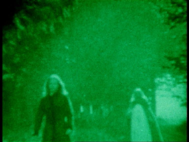 In this found-footage study shot with a green filter, we see the face of a woman standing in a forest, a repeating countershot showing her feet lifting up to take a step.