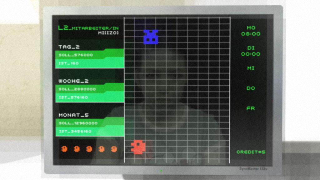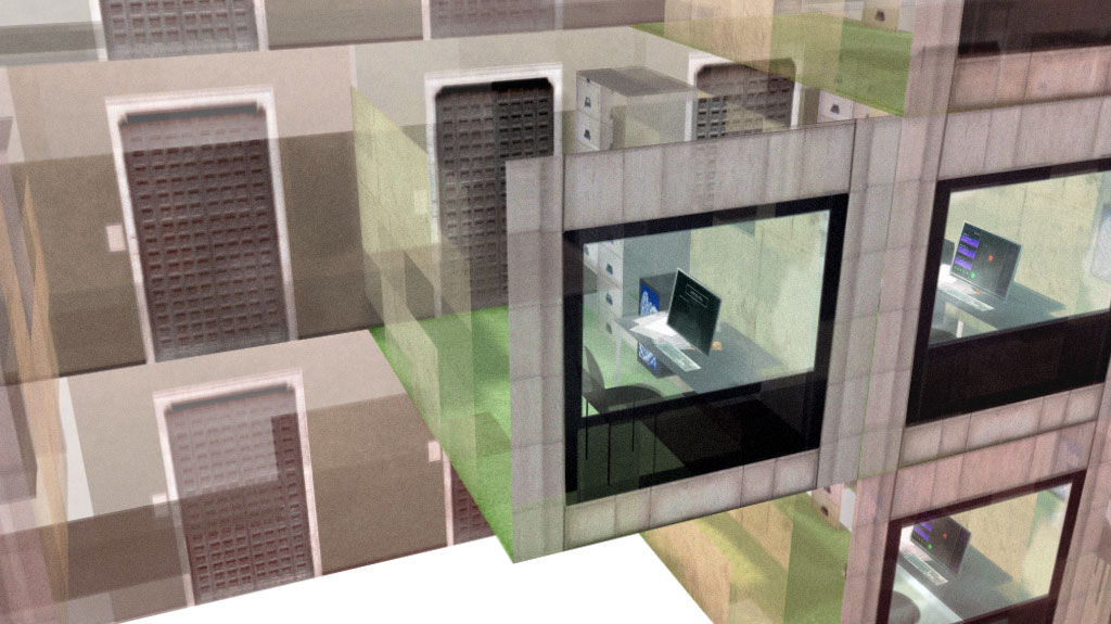 The fragmented path leads onto the street and into an office building in which computers running a video game occupy identical rooms. The reflection of a person´s face can be seen on a monitor in one of these offices, and the face melds with the game´s grid.