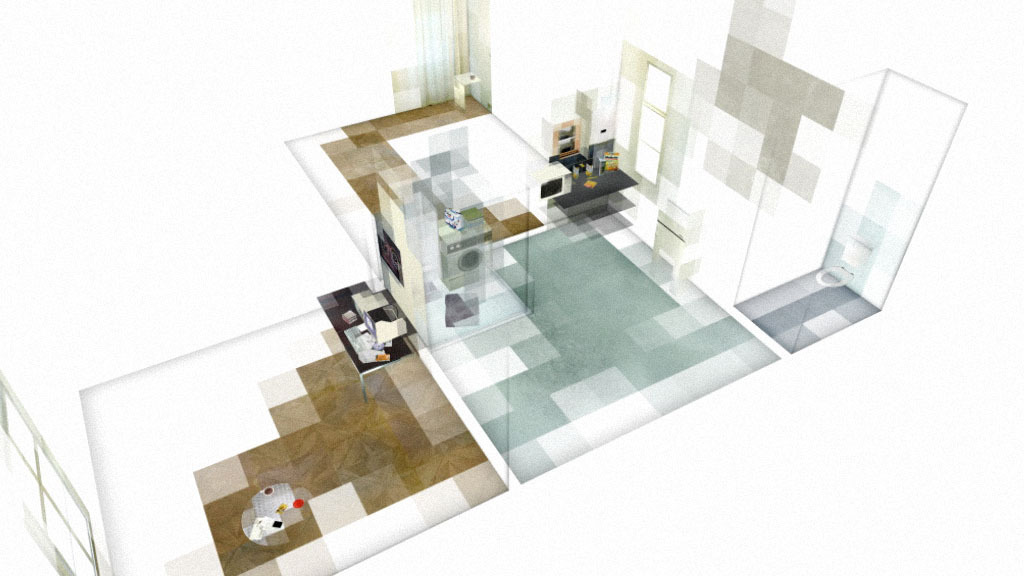 Black lines form a polygon on a white background. In one of the corners a line grows upward, creating a three-dimensional space. Small coloured polygons with a variety of shading spread across this area until a floor, furniture, windows and walls become apparent. A fragmented apartment with a cup rotating in the microwave, but no humans. The soundscape is minimalistic and resembles noises, emphasizing the impression that the spaces lead independent lives when space particles multiply and generate new environments.
