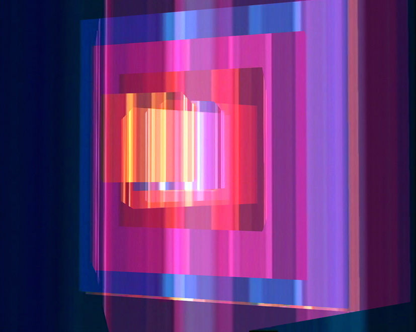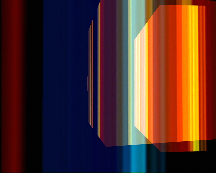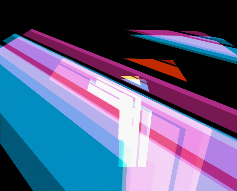 laid out minimalist images, and different than the omnipresent filtering and layering experiments. Chronomops opens up a shimmering, colourful space that is simultaneously an excess of colour, frenzy of perception, and pop carousel. An abstract architecture of vertical colour bars is set in endless rotation, whereby the modules and building blocks fly around themselves and the entire system likewise rotates. The forced, in part jerky movement forms a digital maelstrom whose suction pulls the observer deep into it.