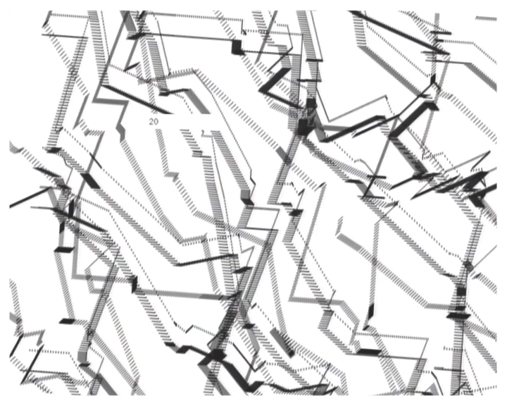 ... In her media installation Void.seqz 5 Annja Krautgasser works with a specific script she originally developed for audiovisual performances. The computer animation shows an initially white surface. Short black lines break in from the borders, err in coincidental navigation over the projection surface and compose a growing pattern. In an autogenerative process of accumulative growth and overlap an abstract image emerges and finally freezes, until the process starts all over again and creates a similar but never identical picture. The parallel audio track by composer Martin Siewert unfolds an atmospherical soundscape which swells as the picture evolves...