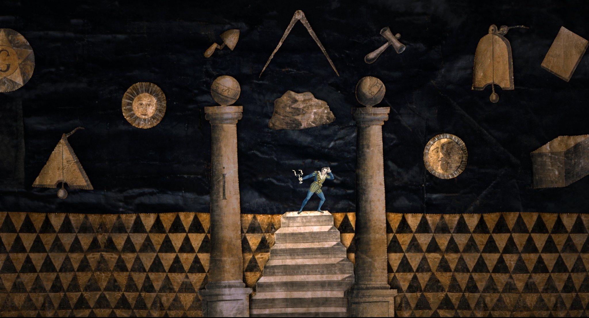 “K 331 in the Head” is a film miniature about Wolfgang Amadeus Mozart. Taken from watercolors, oils, copperplate engravings, lithographs and drawings made during the composer’s lifetime and accompanied by a hurdy-gurdy playing his “Alla Turca” piano sonata in A major, well-known figures from his music set out on a journey through time and space under a gigantic, never-ending cloth of the world at night with glittering stars. Sixty portraits, views of cities, landscapes and stage sets are divided up into individual elements for sixty seconds in a complex technical process, and then, in a three-dimensional space and without a cut, put back together again.