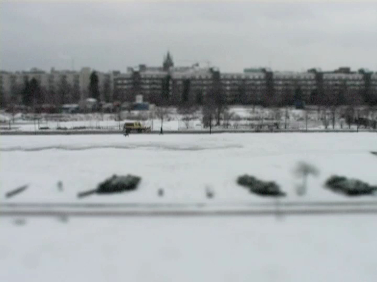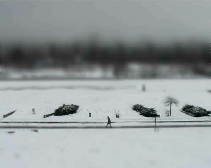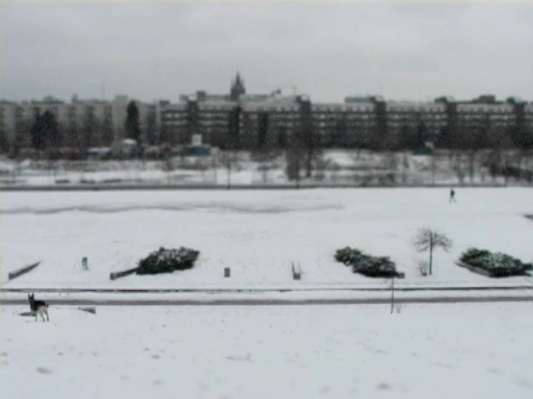 The camera captures a fixed view of an urban winter landscape. The white of a snow-covered meadow is crossed by two paths used by bike riders and pedestrians; a row of houses and a street are visible. mauerpark turns this apparently simple setting into an interesting examination of perception and urban space.