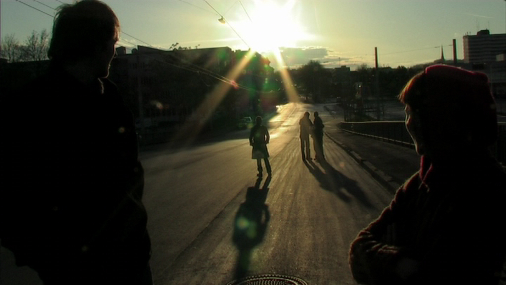 At first glance everything seems motionless. A street, passers-by, a sunset, all accompanied by electronic humming: Current Shot 01 by Stefan Kushima and Philippe Gerlach consists of a single 15-minute shot. The picture is framed by the upper bodies of two people looking into the light of the setting sun. The camera is positioned behind these two figures. In the center of the picture a single figure can be made out, next to it a group, whose shadows fuse together. None of the faces are discernible, and they all transform into silhouettes, with a yellowish light from the sinking sun shining above them. In the background are factory smokestacks that underline the uncertain nature of the landscape: Is this an urban wasteland somewhere in Canada or a suburban street in Linz´s Urfahr?