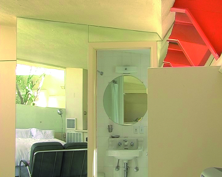 And the gravelly voice, apparently that of an older man, tells the story of writer Steve Lowe, who purchased the motel in 2000, renovated it and started accommodating guests there for the first time in decades. The video doesn't show the building's architecture in the style of a professional brochure. There are brief glances at details, as if a potential customer were inspecting a room before staying there for a night: the concrete-block walls, the windows that open up onto a garden, the roof's red iron trusses that were inspired by the shape of the nearby mountains, the lush vegetation. The reason behind the parallel audio and video tracks is revealed gradually. The building and its owner come closer, as if they had been waiting for one another.