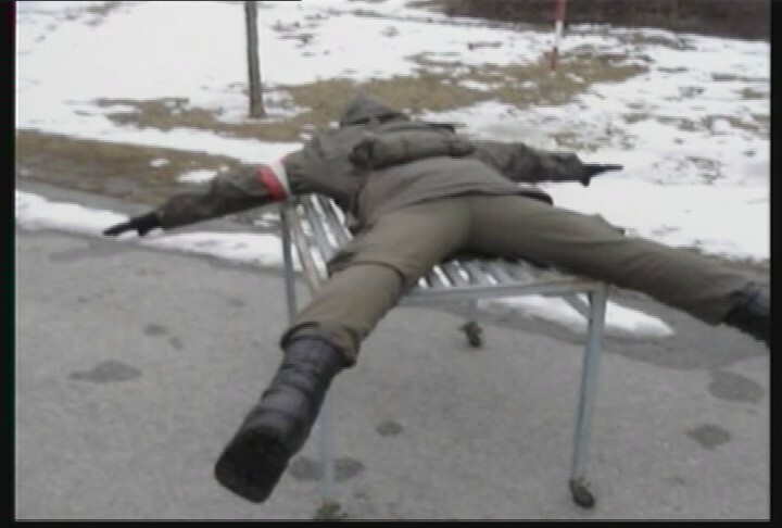 "It´s spooky here... It looks really spooky through the camera." - "You have to say this is the Burgenland Project." In fact however the snowy greenish night-vision images, created by recruits stationed on the border between Austria and Hungary, are not on a search for some woodland witch, and the infrared gaze doesn´t capture "illegal border crossers." The soldiers are shooting a film in the eternal ice of a Burgenland winter, with video camera and cell phone, making images of each other getting bored and acting childish (glaciation can be fun too). They do all the stunts themselves and talk cursorily about their situation and their hopes for the future afterward. Judith Zdesar engineered and arranged the images, interspersing them with a few topographic tableaus.