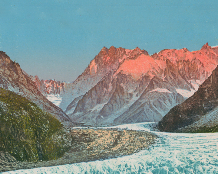 The idea is equally simple and amazing. Ulrike Ostermann arranged postcards from the estate of a certain Ms. Prade to create an endless Alpine panorama, then explored her highly artificial landscape with the disinterested gaze of a weather camera. The final product is an almost threatening world comprising an Alpine idyll and economic wonder. Along with soft, almost sweet music by Vienna’s electronic duo kilo, the mechanical observer comes alive; restless and without orientation, it randomly burrows into the mountains, only to find itself in another oppressively narrow valley. In the end nothing is left for the viewer, who has been sent off to wander, but the conclusion that they are lost in this frozen, vibrantly colored 1950s romantic world.