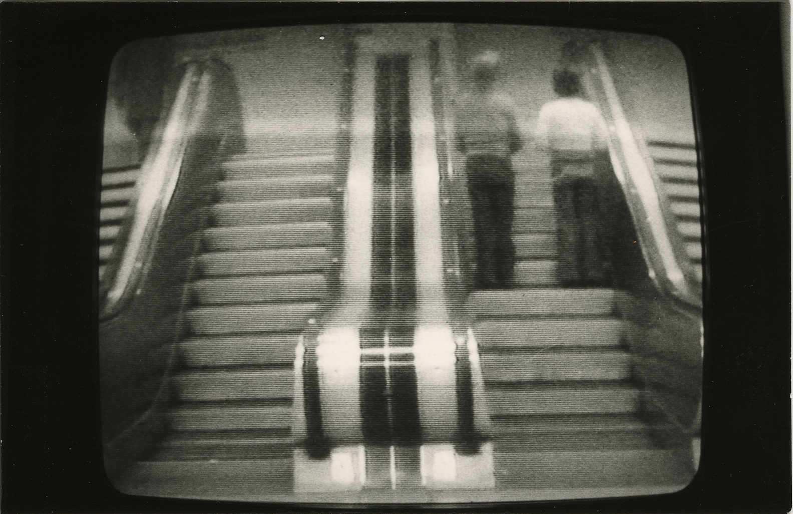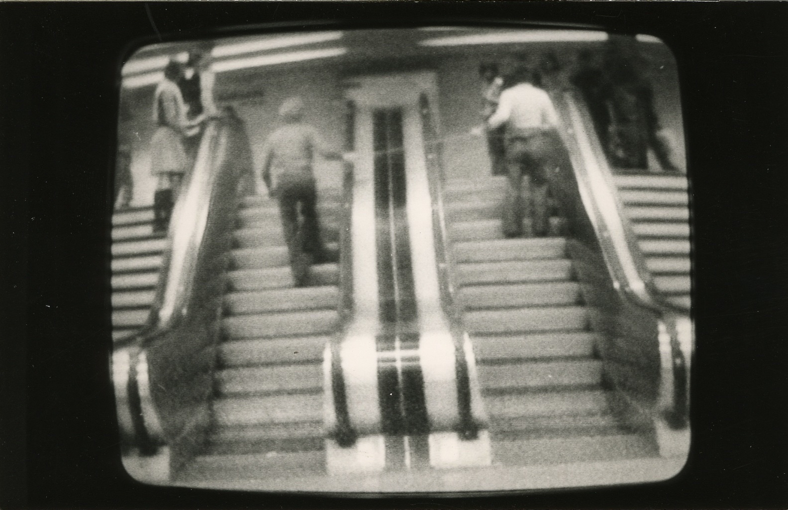 The escalator, consisting of stairs moving downward, demonstrates the existing communication systems in five separate phases. A man and a women are connected by a rope tied around their bodies.