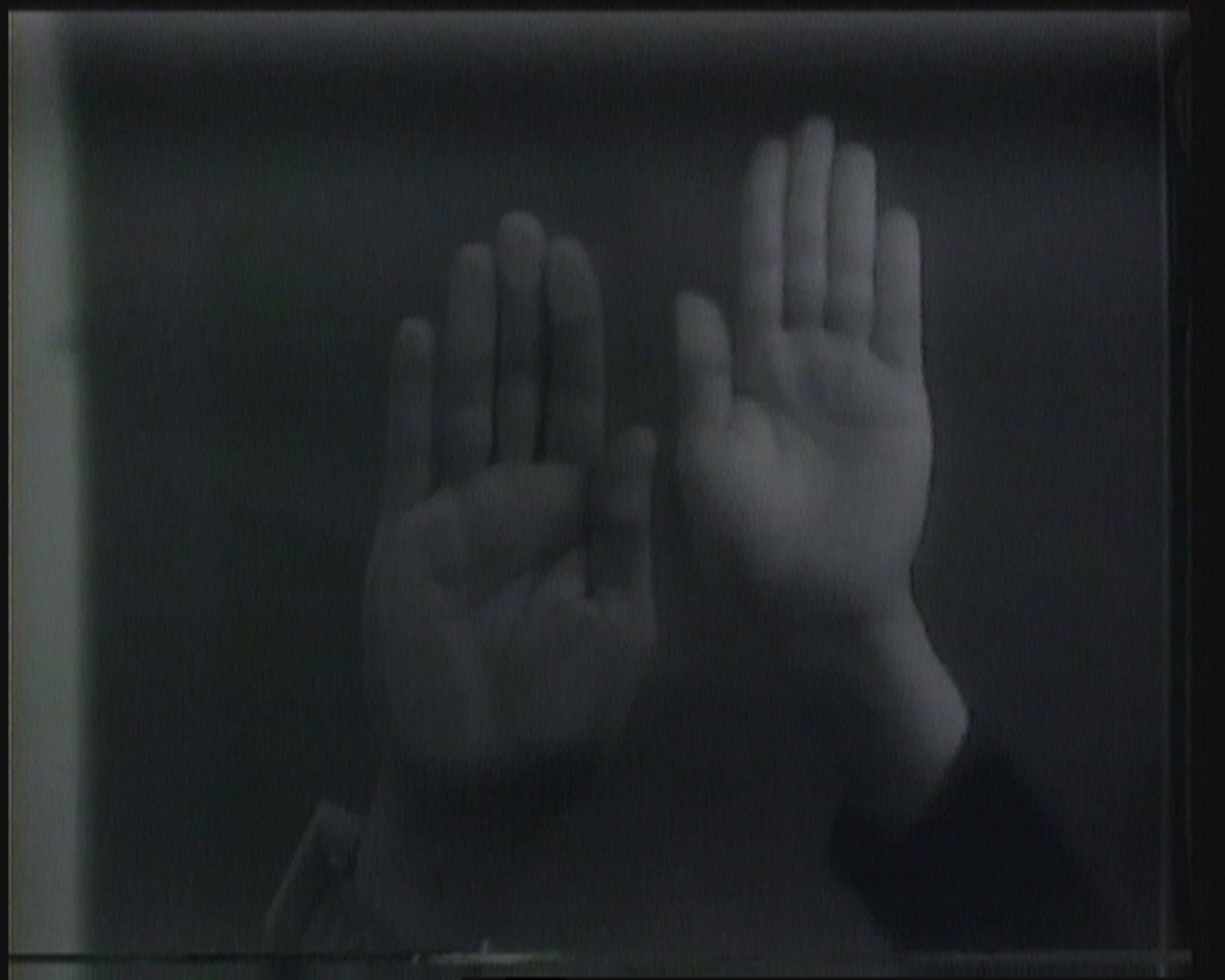 VALIE EXPORT adopts a position characterised by shifts or discrepancies. Each conceptual gesture is introduced by inter-titles that indicate the verb she is about to illustrate – a didactic technique that brings to mind educational films. The artist gives instructions facing the camera, and a transparent glass screen is used as an intermediary projection surface that marks the separation between her body and the camera. The association of language with action (both the body and the medium) simultaneously separates the spatial structure of the performance from its perception. As literal as the actions may seem – licking the transparent surface to illustrate the verb to lick, sticking her ear against it to convey to listen, touching the glass screen with her hands, palms towards to the camera, for the verb to touch – above all, the real point of contact is in how the viewer receives the image.