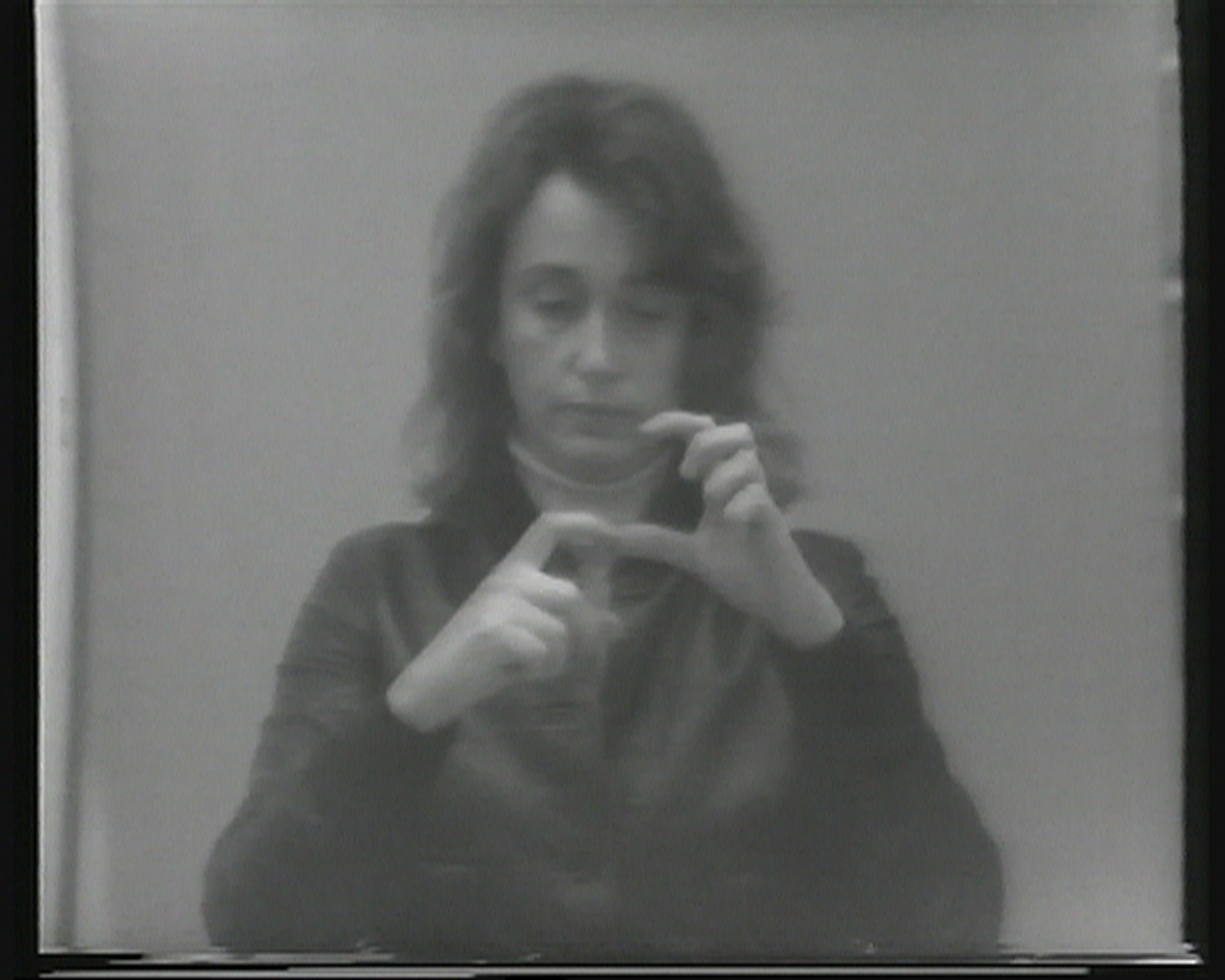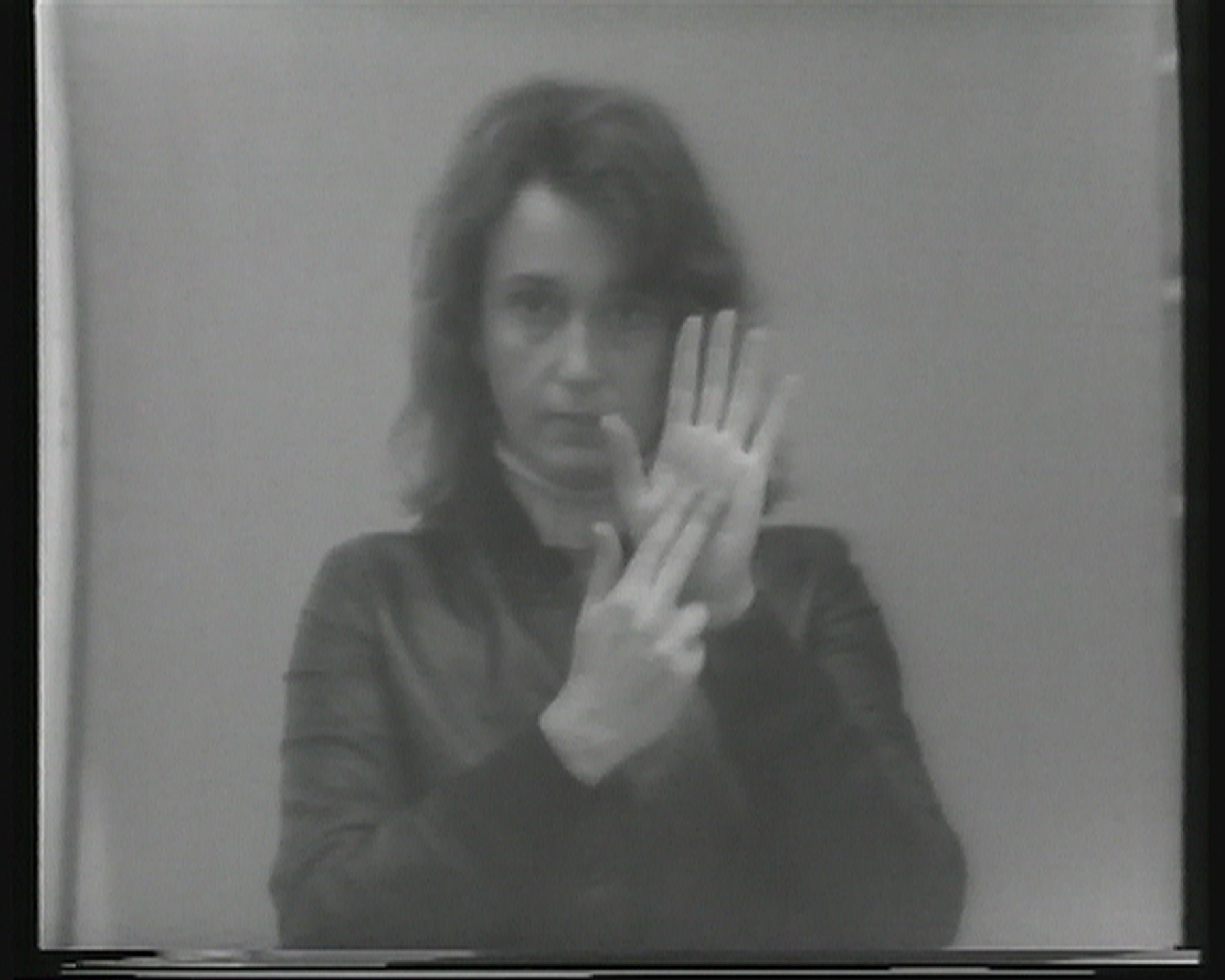In Visual Text: Finger Poem, VALIE EXPORT communicates with her fingers. Sign language, as an elision of word and gesture, is investigated in this performance-to-camera work. The artist writes: "The body as carrier of information, in order to convey both spiritual and physical contents, is the reflected image of the internal/psychological and of the external/institutional reality."