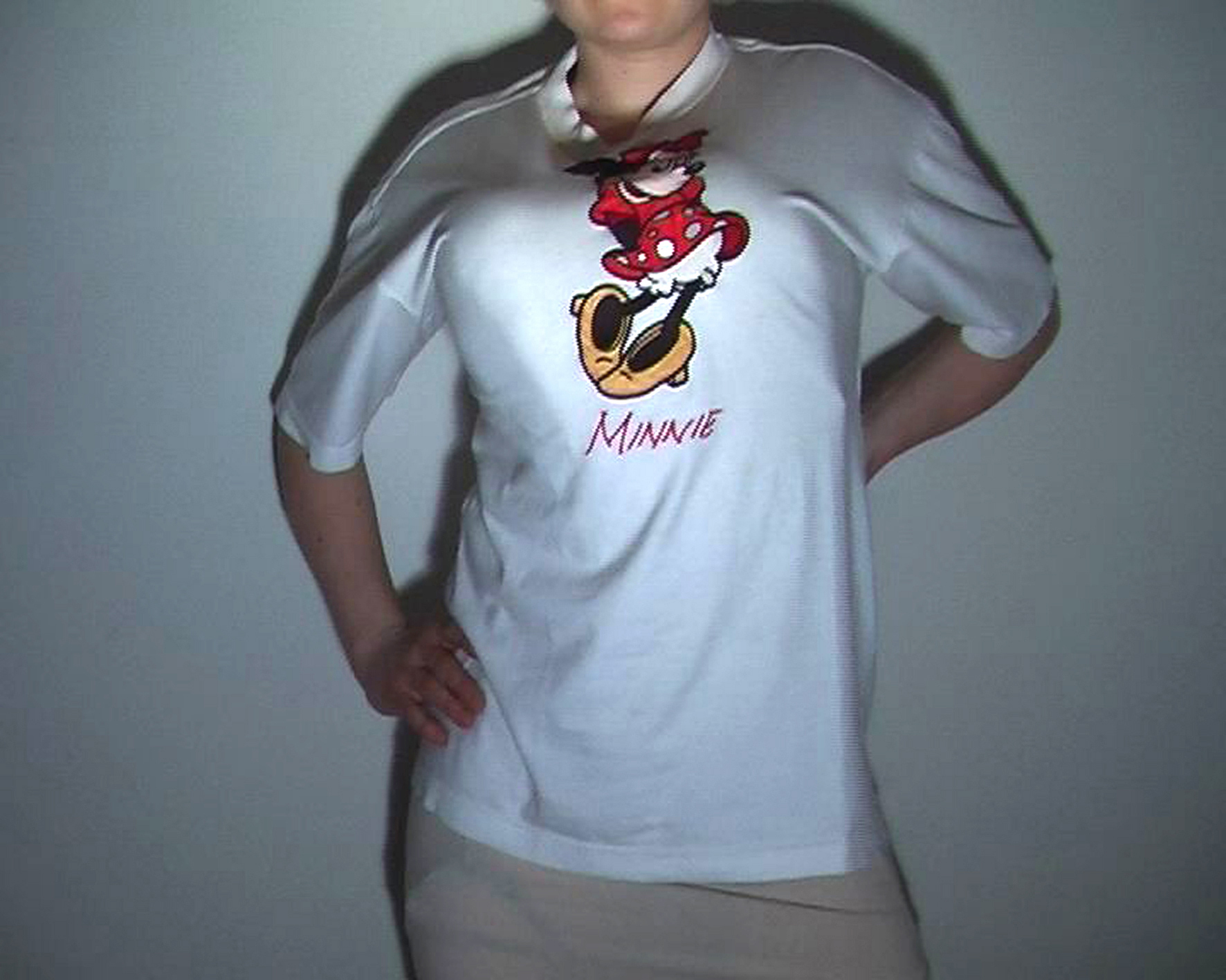 The fact that it belongs to Minnie, the Mouse, becomes clear as soon as the performer positions herself properly. From then onwards does the beholder gaze back at Minnie Mouse from/on the T-shirt and the torso/upper body/chest of the artist.