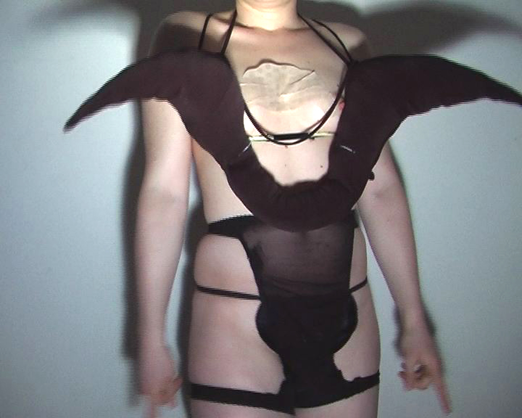 Initially, Petschnig, who performs in all of her works, takes up the flirtatious-coy pose of Minnie: With hands entangled behind the back she protrudes her chest to the viewer, which in the first few frames creates new and different shapes through various textile objects under the T-shirt: the breasts grow monstrously, the spine moves to the front, the bottom deforms in a voluptuous corset. The new shapes are presented in front of the camera through an impressingly lightness/ effortlessness: the performer flattens her T-shirt, strokes the "objects" with her hands and by moving sexily she accentuates/emphasizes her erotic potential.