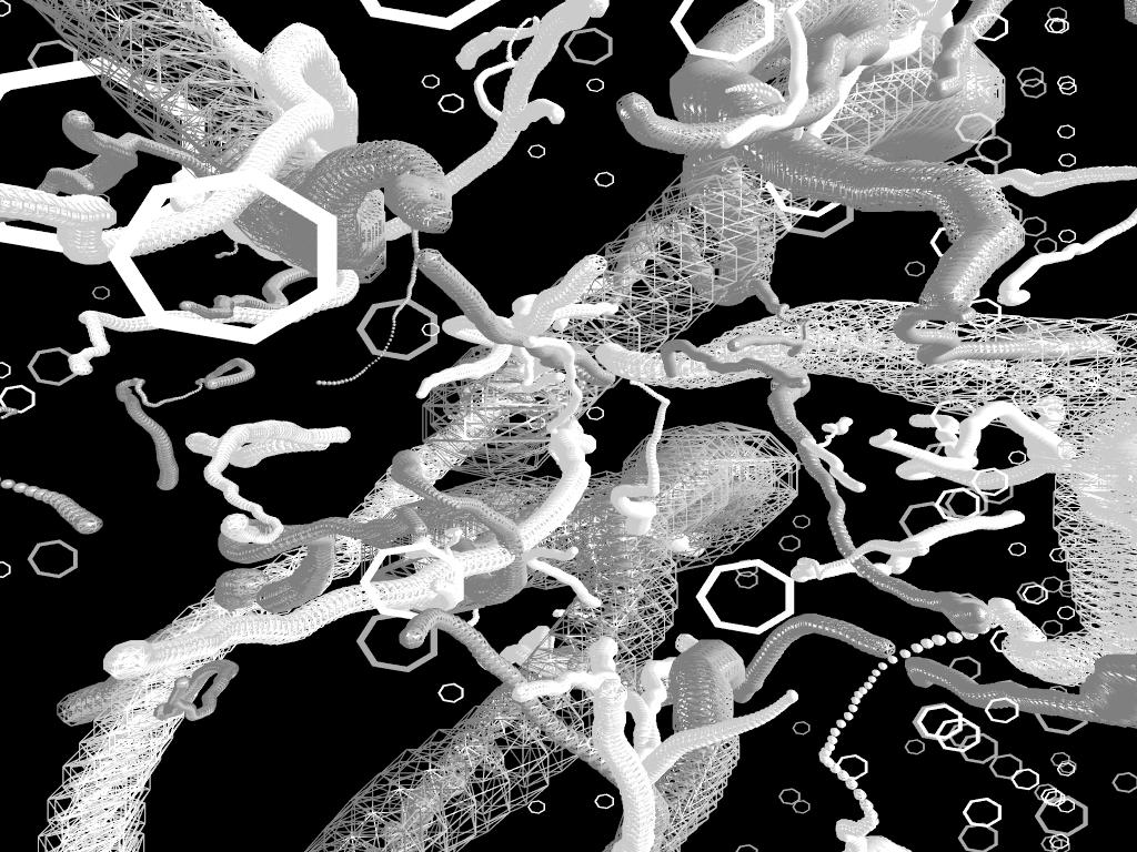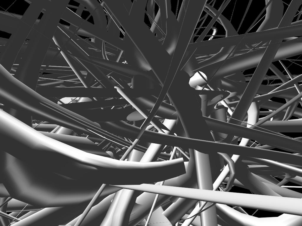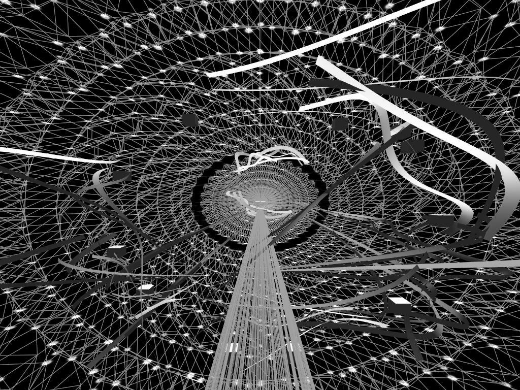 The Flexible Cities are oriented to new forms of representation, such as multiple perspective projections and layer x-ray. Multiple perspectives and many, transparent layers can thus be represented simultaneously. The artificial urban spaces are particle spaces, magnetic field spaces, spaces with different gravitations, continuously distorted and flowing spaces, which all suggest a new orientation, development and inhabiting of the space. The inhabitants of the Flexible Cities are no longer oriented to conspicuous forms, axes, edges and clearly demarcated areas, but rather to the density distributions of data, orientations, and changes in scale and transformation vectors. The Flexible Cities are subject to constant changes. They principally change in real time and autogeneratively. In addition, chance is integrated into the mathematical framework. This occurs in the form of random distributions of data in the matrices through random generators and white noise. In conjunction with the computer as a determinist system, it would be more correct to speak of pseudo-random numbers. Drafts as intentional, purpose-oriented acts are replaced by aleatoric processes in the form of whole series of formal transformations, from which the programmer and the artist choose according to aesthetic criteria. They let the machine calculate and are attentive enough at the same time to recognize their own purposes when they encounter them in the flow of forms.