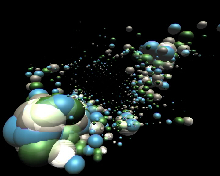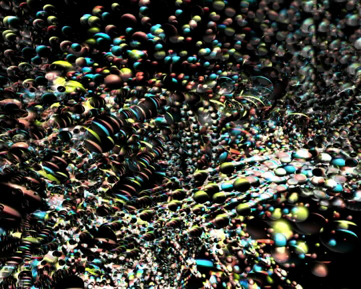 The soundtrack, a hypermotoric, gloomy, technoid, electro piece offers the spasmodic structural death throes a menacing resonating space. Then comes the Big Bang: dice, cube, bubbles, and other micro-spheres burst their grid shape enclosure and become what they had always been subliminally: anarchic swarms of particles that no longer know any up or down; know no regulation and no law, but instead, flow wildly through one another and have an effect one another in a way that is just as spontaneous as it is self-regulating.