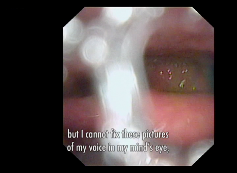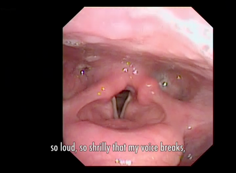 How strenuous it is to speak! Particularly in a video intended to be seen from the outside! In VALIE EXPORT´s video, the inside is turned to the outside. This does not happen by itself, it has to be forced. The voice has to come from a larynx displayed from the inside out. For this, a device is needed. How strenuous it is to let the voice out! Often, exertion comes from things and beings that should not be let out. Wild animals? The voice is the wild animal, which should be restrained from the outside world, but the struggle here is the eruption. The eruption of the voice-volcano. This voice is not silent. The purpose of this device is to hold back the voice so that it can be studied; so the active vocal chords can be observed. But there the voice, suddenly, forces itself out through an opening, which does not want to be opened! The outside is there, please, voice, come out! It can always come out, but only through this small device, which lays bare the vocal labia, lapped around by saliva, by juices - a woman´s only means of representation - something fluid, which otherwise you rarely get to see (therefore the more curious we are! Immediately you want to look inside. Please - go ahead!). The voice obtains consciousness through this laryngoscope, and can make essential statements such as she: speaks. The larynx is the emergence, in fact the permitting of emergence. Yes, that´s what it´s here for! It lets out what should be confined: the voice, in a language which someone, anyone must understand, yes, must! Otherwise there is no speech and the voice is of no use; so speak up, speech! From constant sealing: let it out and speak up! Leaving cover behind only to discover a pointed rifle. The voice has to leave cover; needing a device to sound things out to separate the voice from its home, the larynx, and to chase it off. The voice is forced to do something, which it likes to do anyway. This is the biggest effort: to do something that is permitted, but intrinsically separated from the world. It forges its path before it is entirely lost.