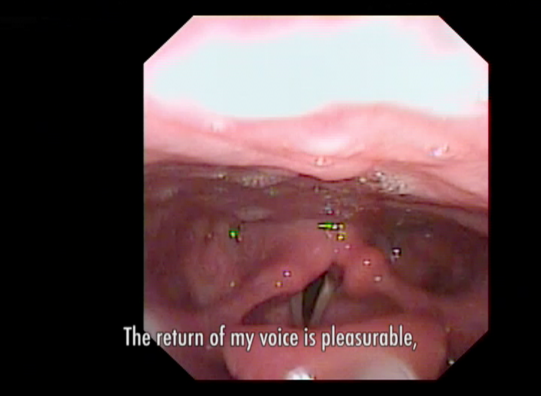 That the vocal organs visually rhyme with female genitalia, that when they are in use, they create a fascinating flow of movement and change, makes this work a compelling new iteration by an artist who has given voice to her female body through a myriad of frames.