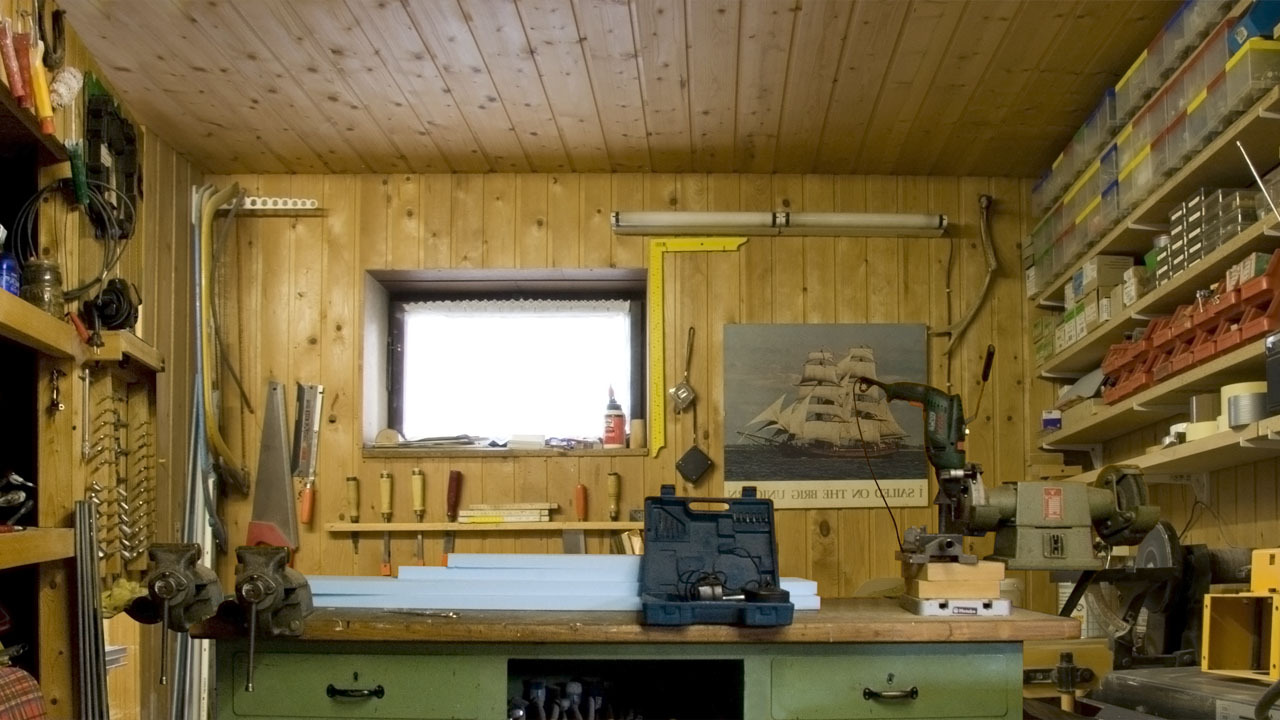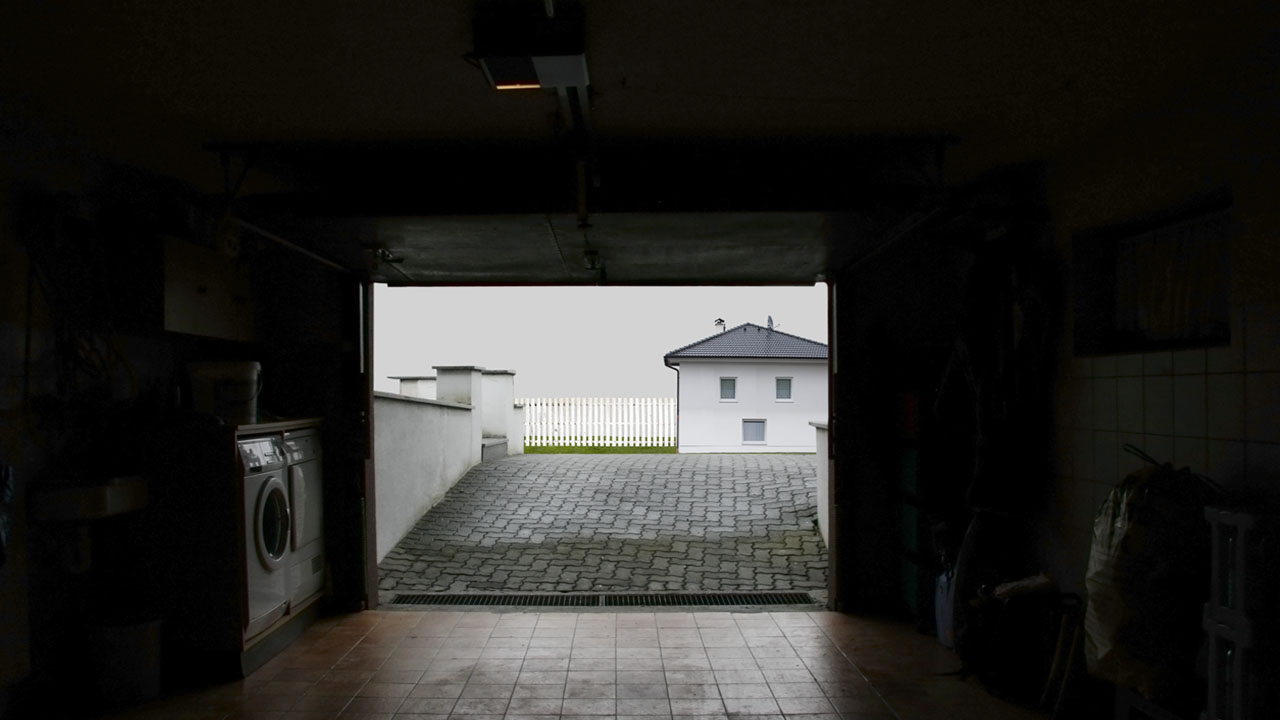 Did you ever, ever notice, the kind of thoughts I got? Und noch eine Passage durch den schwarzen Tunnel zum letzten Kreis der HEIMathölle: Kleinwinkelig- klaustrophobische Kämmerchen, die sich in eine psychedelisch zerdehnte Ferne auswölben. Das Geräusch eines motorisierten Rasenmähers vor dem Fenster. Heimwerkerzubehör, säuberlich in Boxen verpackt und in Regale gestapelt. Bohrmaschinen, Sägeblätter, Schraubenzieher. Ein nervöses, elektrisches Zucken: Eine Neonröhre blitzt auf. Schließlich: Ein Blick durch den Längsschnitt einer Garage. Mit einem aggressiv schnappenden Geräusch klappt die Kipptüre zu.